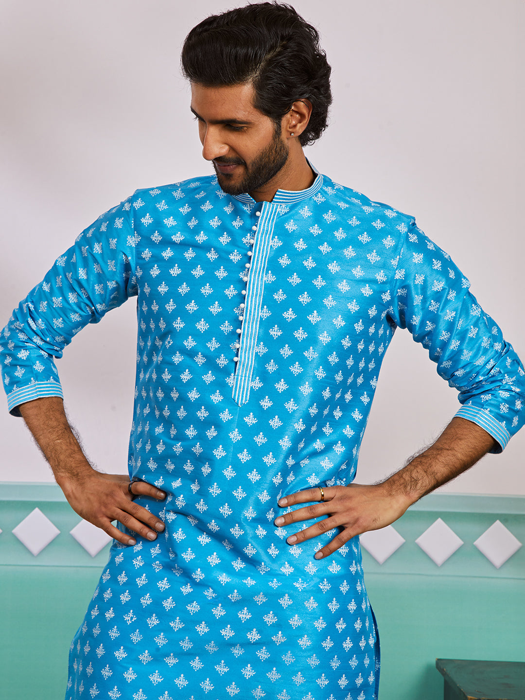 This men's kurta elegant allover printed design, adding a touch of sophistication to traditional wear. The kurta is adorned with a DK embroidered collar patti, enhancing its refined appeal. making it a perfect choice for festive occasions, celebrations, and cultural events.