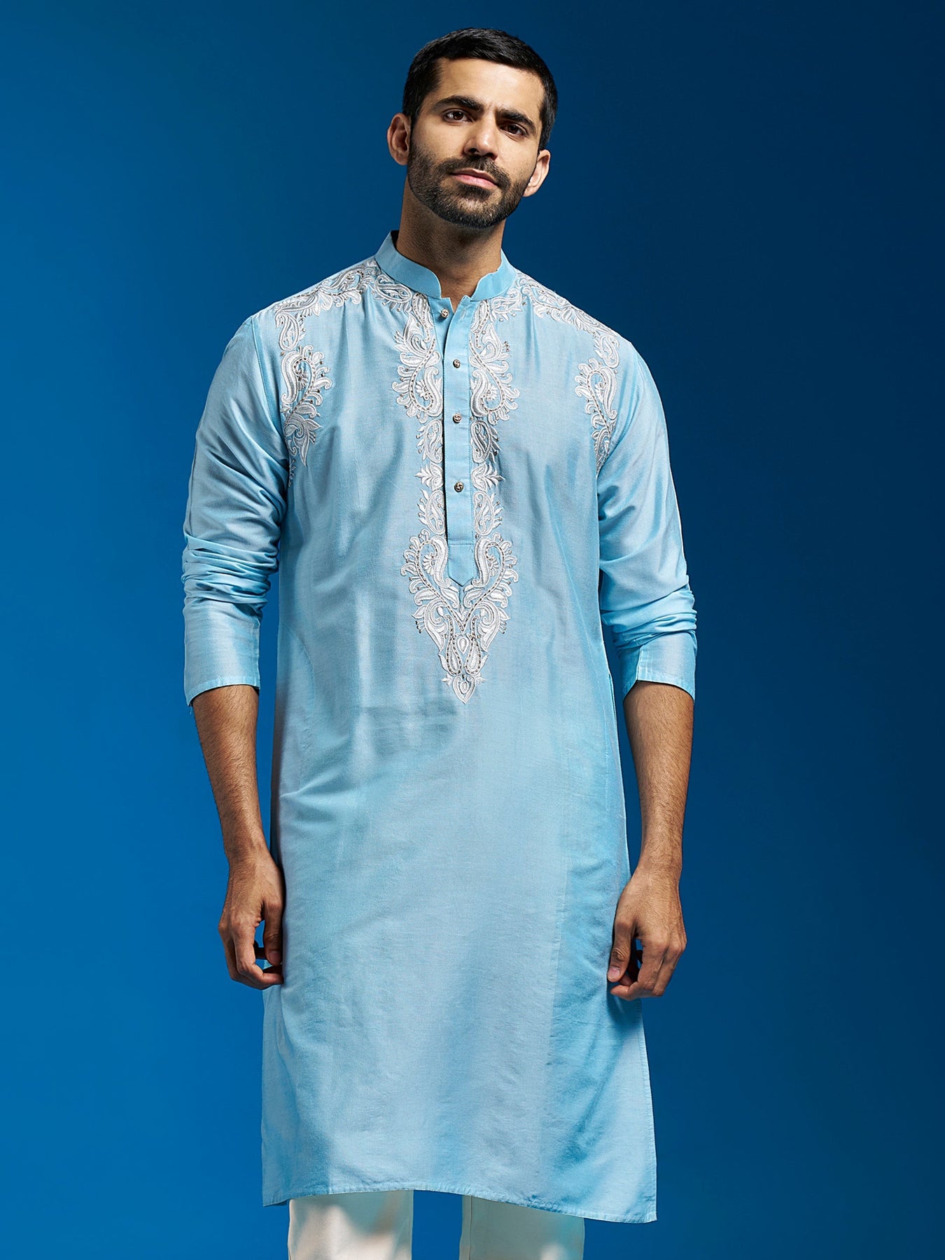 Sport this classic kurta from Sarvati this season. Dress this piece up with your favorite accessories and head out to any family event in style.