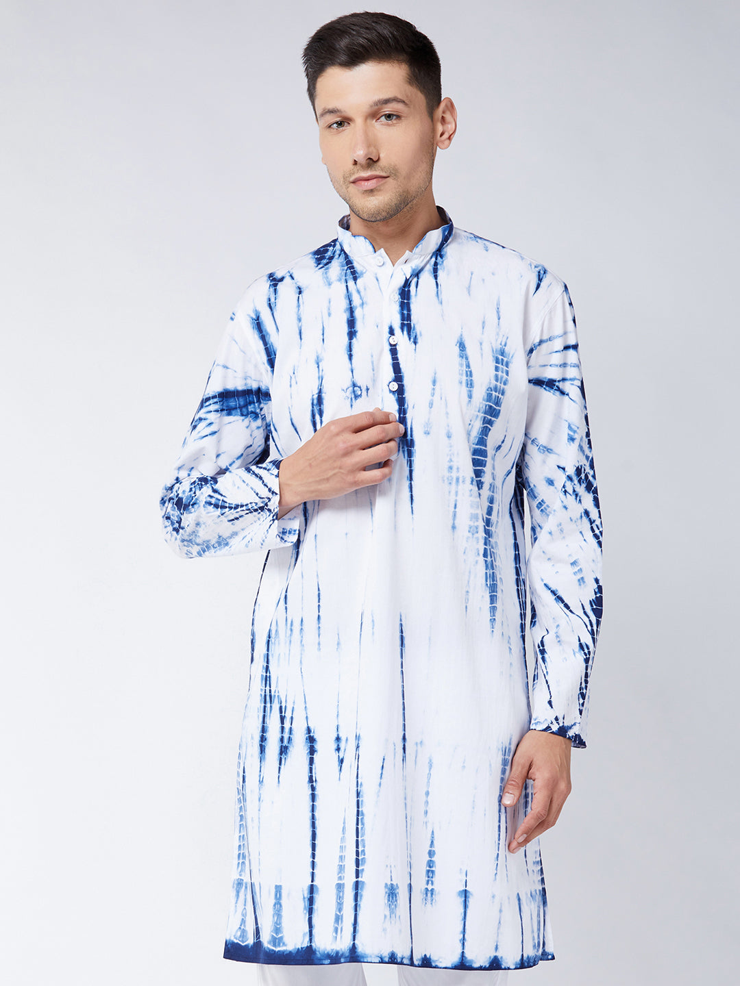 Blue and white tie-dye straight cotton knee-length kurta, has a mandarin collar, button placket, long sleeves, a straight hem, and side slits.