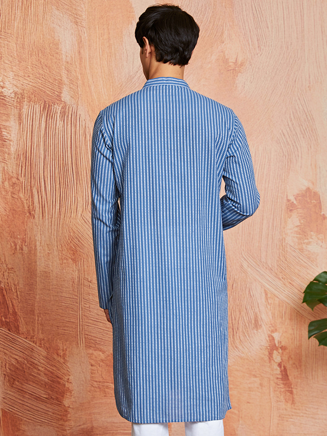 Elevate your summer wardrobe with this Jacquard cotton kurta and pant set, blending traditional elegance with modern sophistication. The full-sleeved kurta features a rich striped pattern,enhanced with intricate woven details that add depth and refinement. The band collar and buttoned placket lend a classic touch, making it ideal for both casual and festive occasions.perfect for summer wear.
