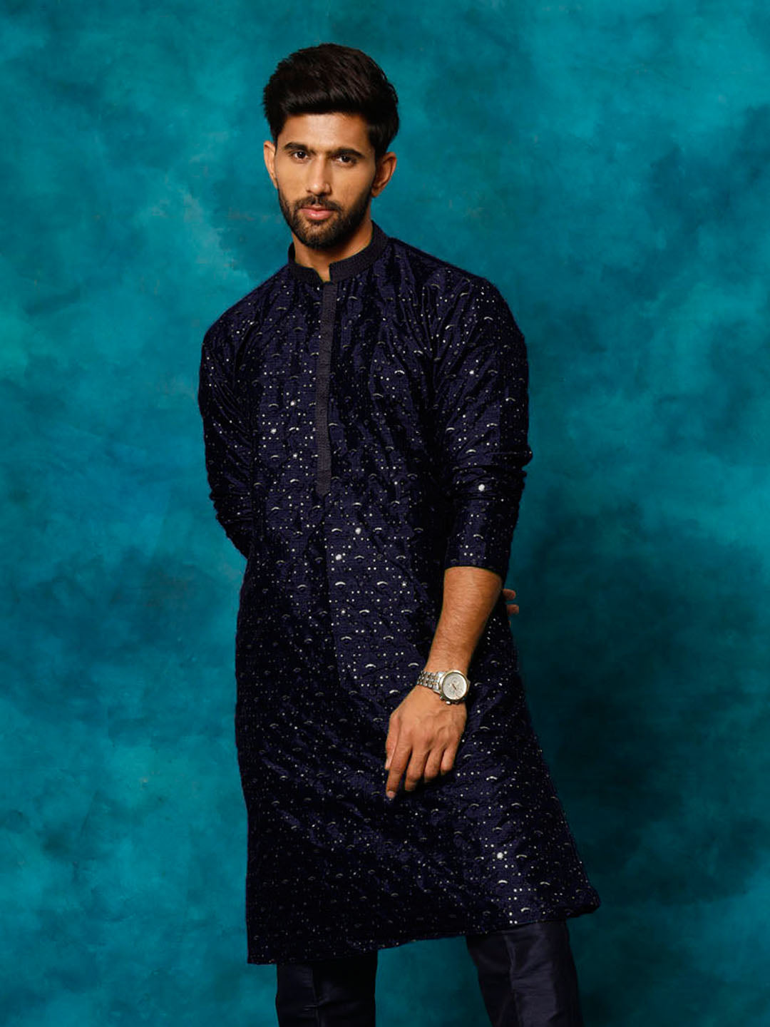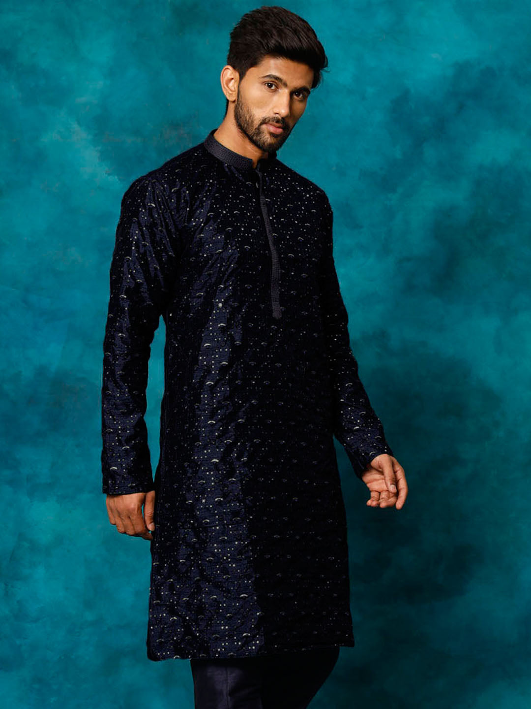 Thread work all over embroidered silk blend kurta with sequins embellishment. Straight knee length , has a mandarin collar, long sleeves, straight hem and side slits.