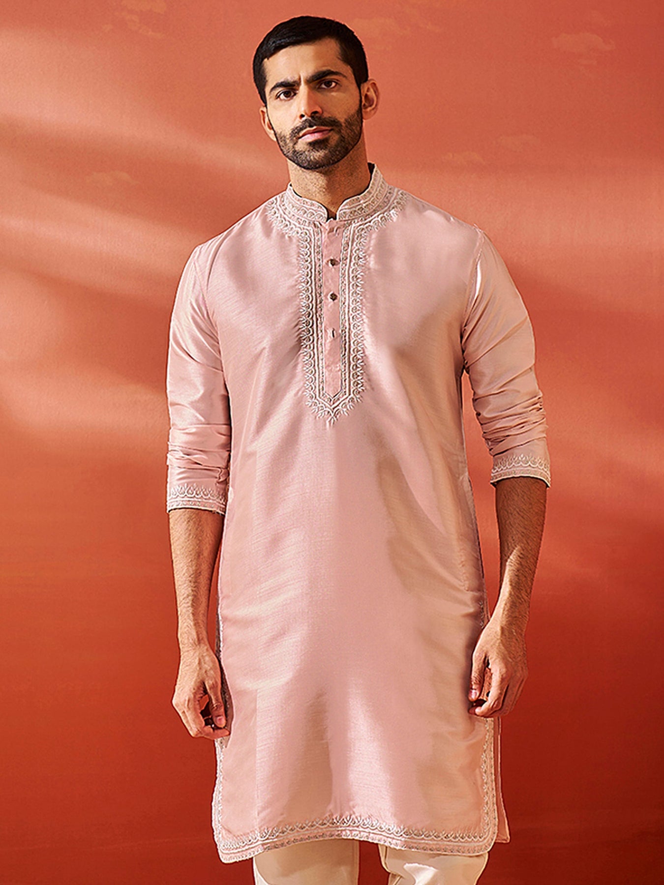 This silk blend embroidered kurta is designed for festive elegance and cultural charm. It features intricate embroidery, a mandarin collar, full sleeves, button closure, U-cut hem, and side slits. Perfect for weddings, parties, and traditional celebrations.