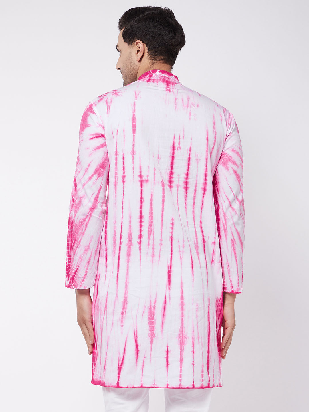 Pink and white tie-dye straight cotton knee-length kurta, has a mandarin collar, button placket, long sleeves, a straight hem, and side slits.