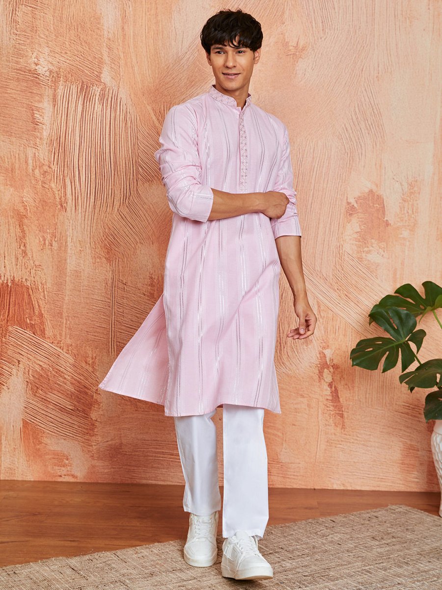 Embrace elegance with this Pink Silk Blend Kurta and Pyjama Set. Featuring a woven Jacquard design with vertical shimmer accents and an embroidered collar placket, this ensemble exudes sophistication. Paired with classic white pyjama pants, it's the perfect blend of tradition and modern style for festive celebrations, weddings, and cultural events.