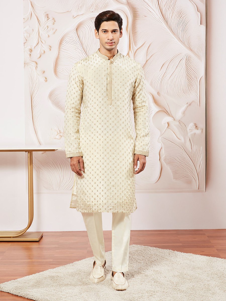 This men's kurta pyjama and dupatta set features an elegant and traditional design. kurta is adorned with intricate embroidery, giving it a sophisticated and festive appeal. It is paired with white pyjama pants, creating a balanced and refined look. This attire is ideal for weddings, festivals, and other celebratory occasions, offering both style and comfort.