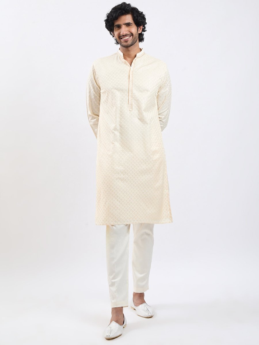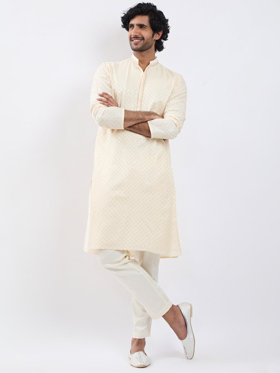 Silk blend Embroidered Sequined Work,knee length kurta,has a mandrin collar, long sleeves,Button closure, straight hem and side slits.It keeps you cool and adds charm to your personality. Wear it in parties, weddings, traditional functions and festive occasion.