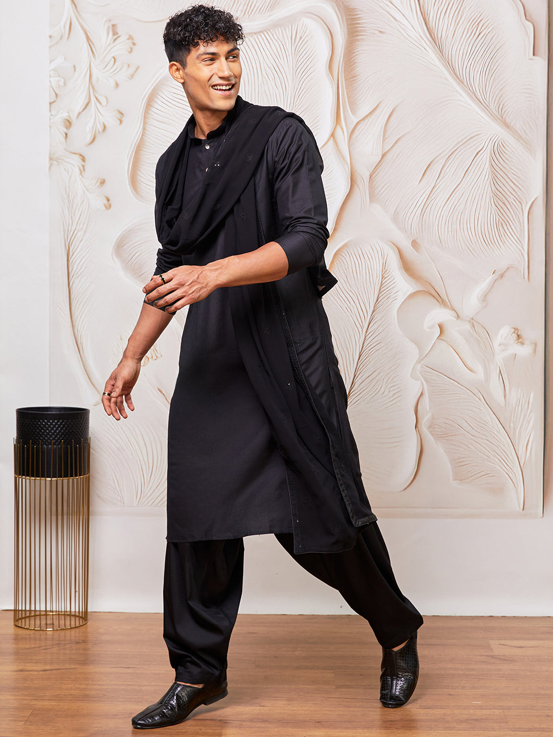 Elegant black viscose kurta set with straight-cut kurta, Patiala salwar, and a lightweight sheer dupatta with delicate sequin border, perfect for weddings and festive celebrations.