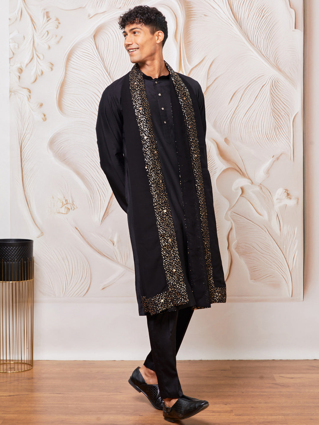 Black viscose kurta pyjama set with knee-length kurta, mandarin collar, and long sleeves. Paired with elasticated pyjama and sequined border dupatta — perfect for weddings and festive occasions.