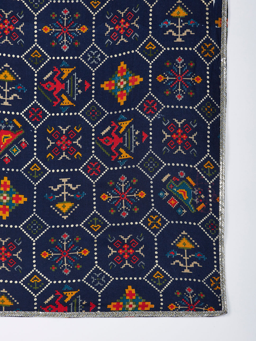 Gold foil printed patola design kurta, has mandarin neckline, full sleeves, and knee length with relaxed fit.With matching dupatta golden lace detailing Comes with viscose pant style pyjama