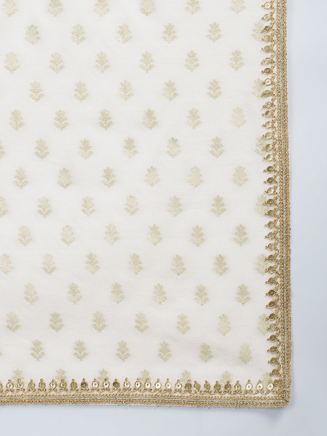 Silk-blend jacquard kurta with embroidered mandarin collar, button placket, and long sleeves. Paired with cream pant-style pyjama featuring a partially elasticated waistband and a matching silk-blend dupatta with lace border. Perfect for weddings, festive occasions, and traditional celebrations.