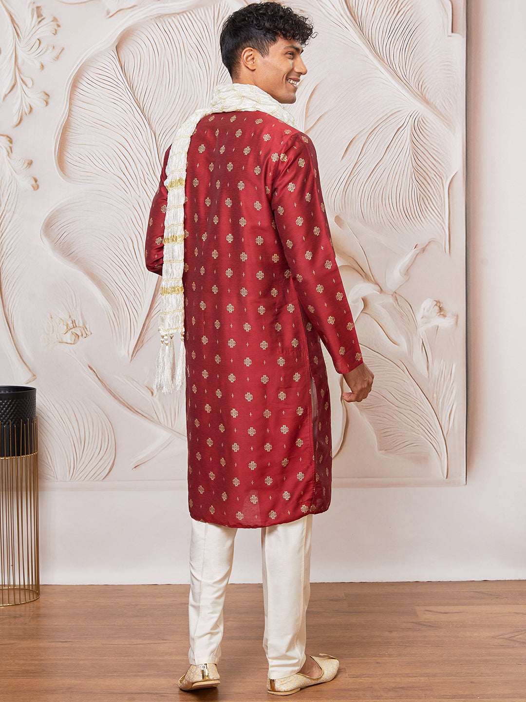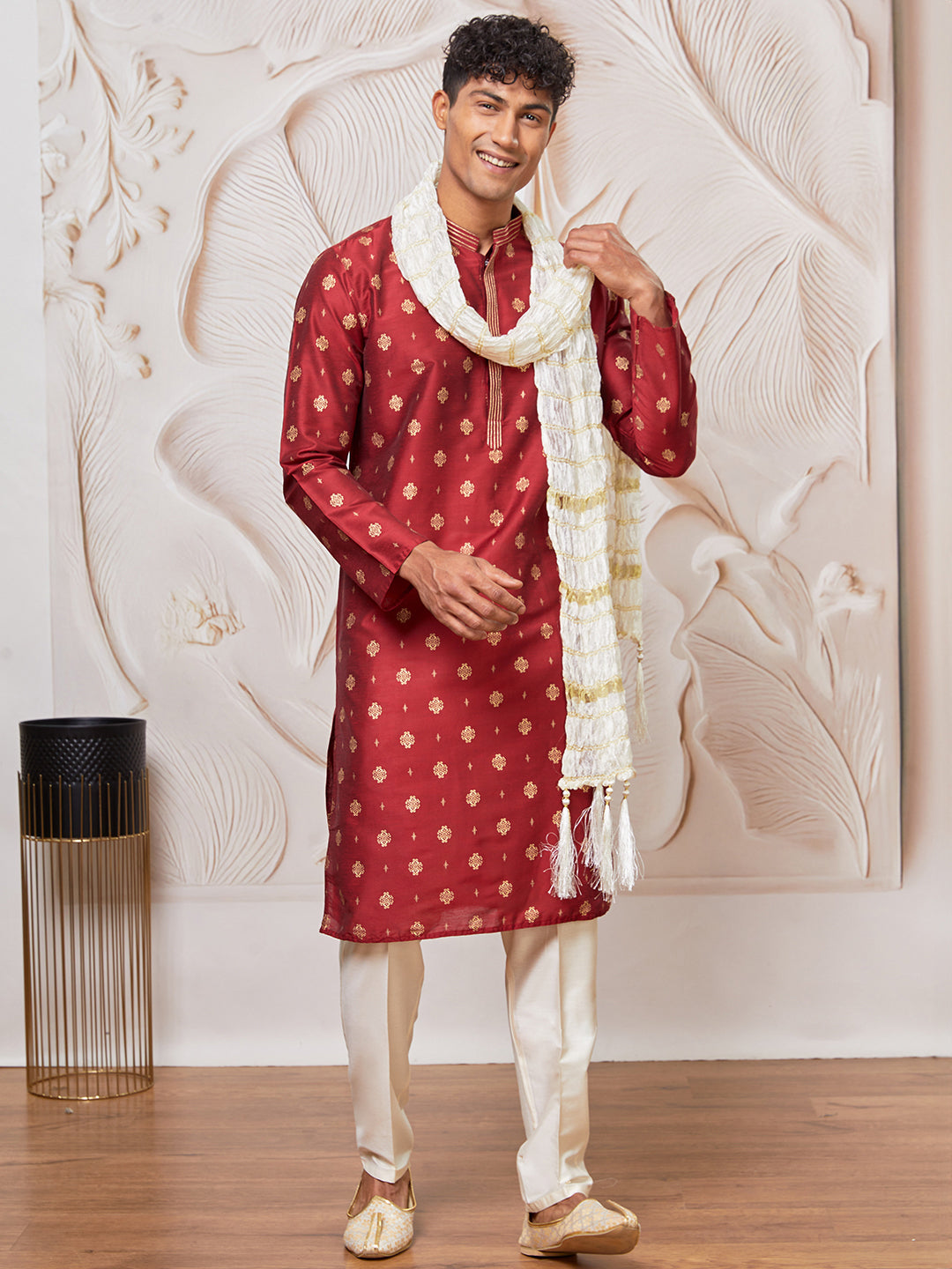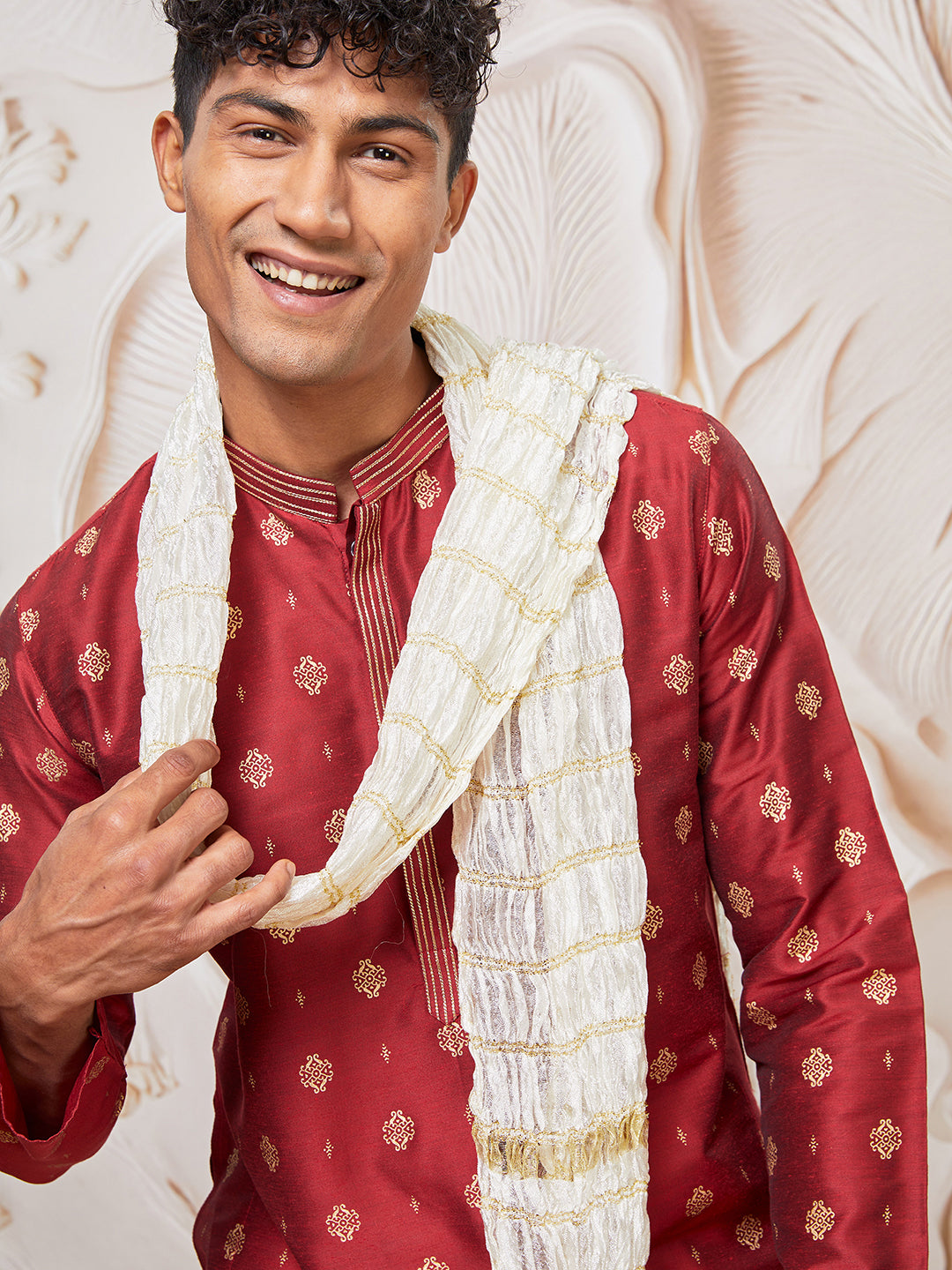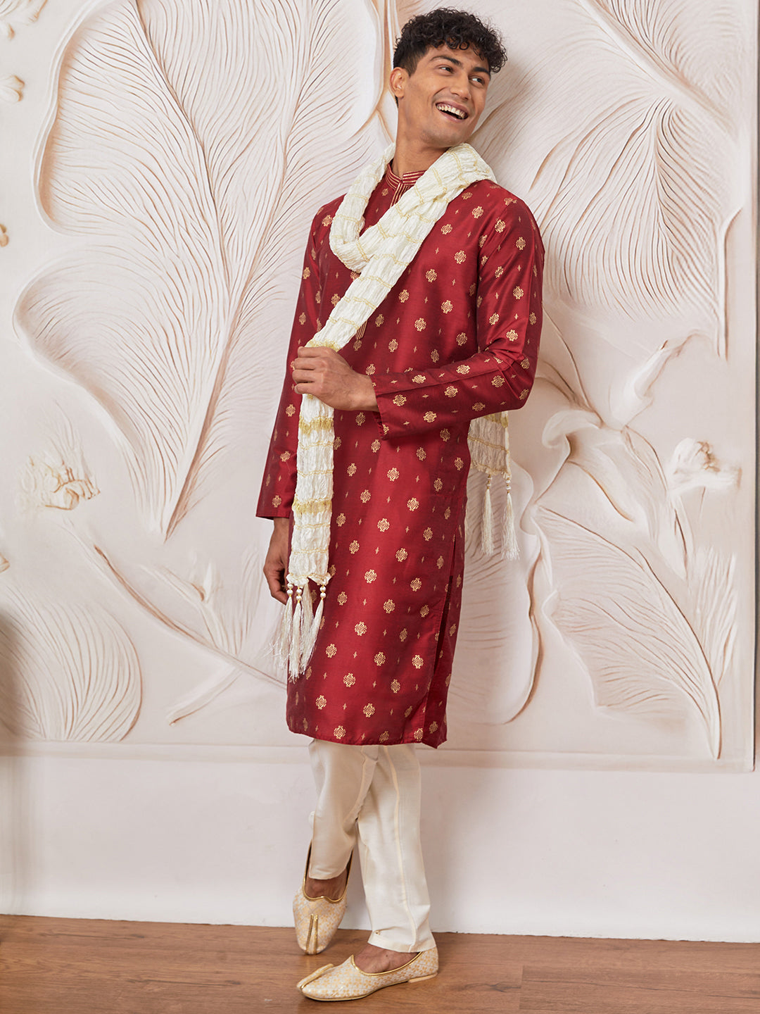Maroon silk-blend kurta with allover print and DK embroidered collar patti, paired with cream pant-style pyjama and matching crinkled dupatta with tassel finish — perfect for weddings, festive occasions, and cultural events.