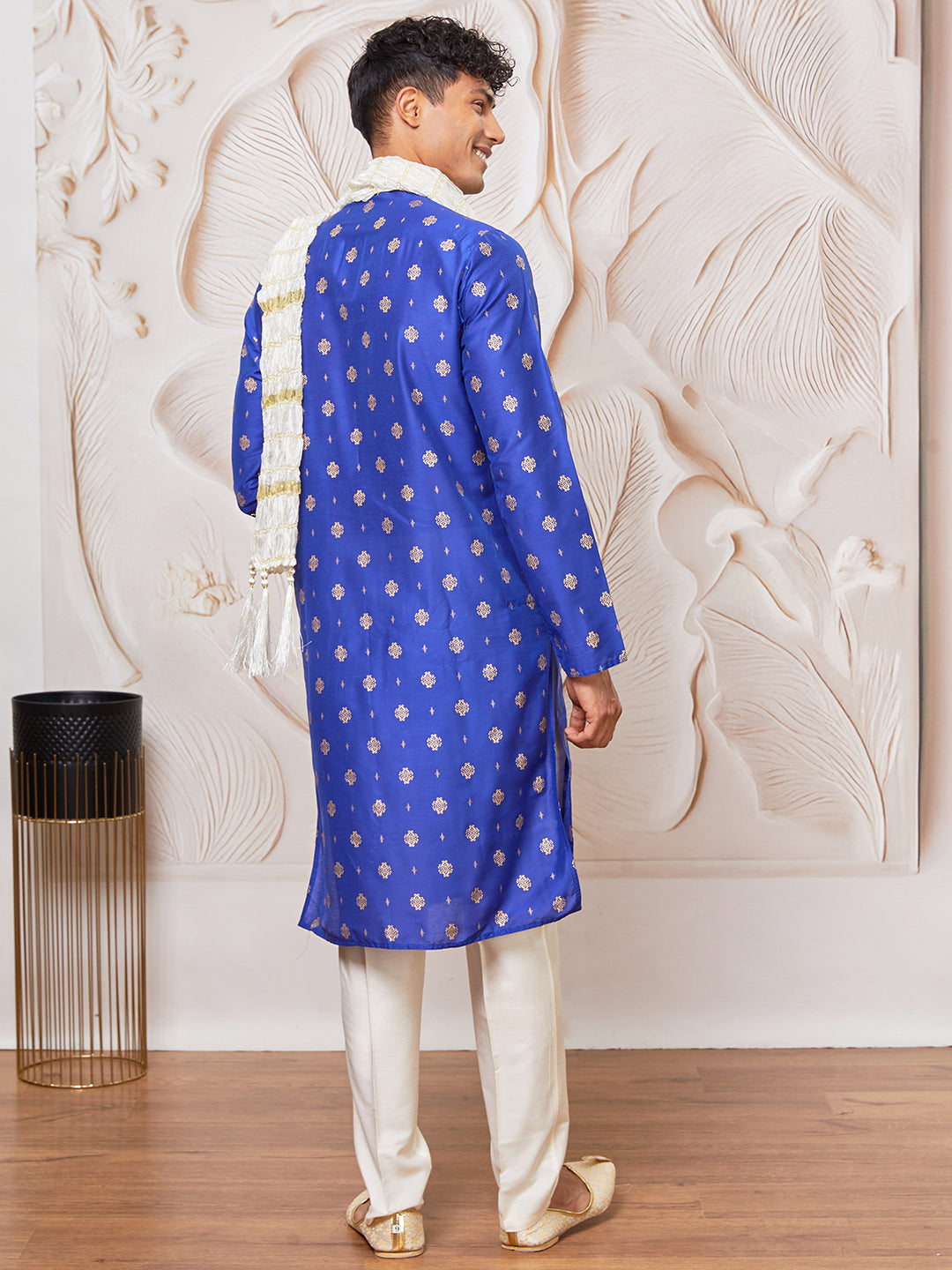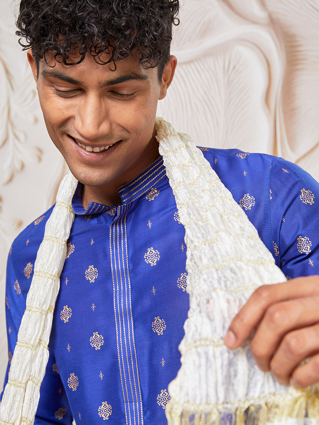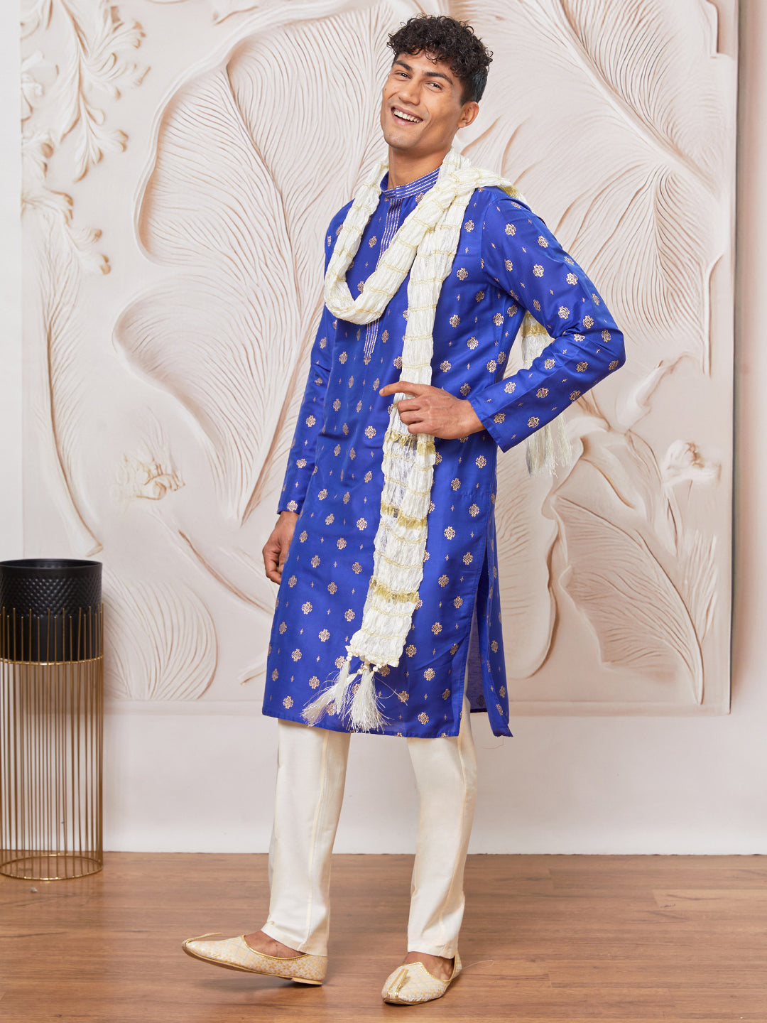 Royal blue silk-blend kurta with allover print and DK embroidered collar patti. Paired with cream pant-style pyjama and a lightweight crinkled dupatta with tassels — perfect for weddings, festive occasions, and cultural events.