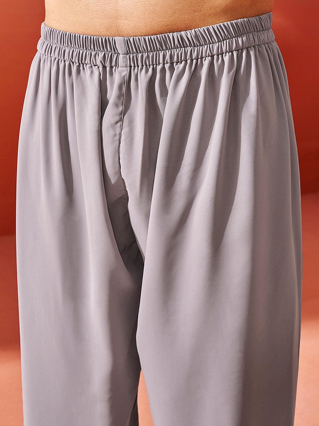 All-over embroidered knee-length kurta crafted in georgette, featuring a mandarin collar, button closure, long sleeves, straight hem, and side slits. Paired with a matching Patiala pant designed with a fully elasticated waistband for comfort and style. Perfect for parties, traditional functions, and festive occasions.