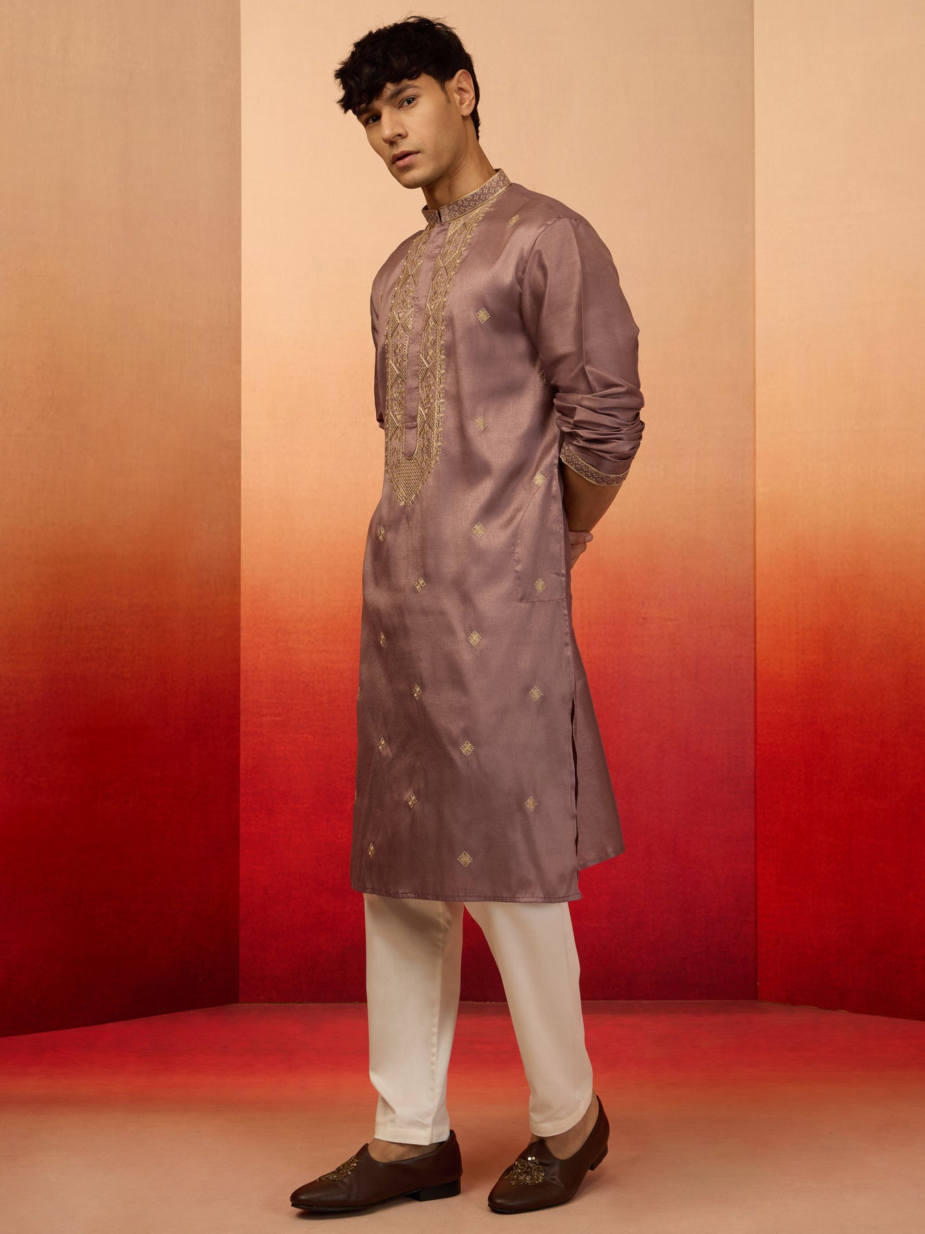 Add designer elegance with Sarvati lavender silk blend kurta featuring beautiful resham embroidery and sequin work with geometric and floral designs, paired with comfortable cream fine satin pyjama.