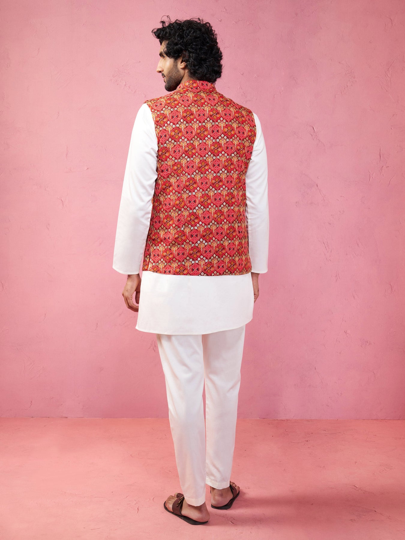 Elevate your festive wardrobe with Sarvati red chinon embroidered Nehru jacket set. Features exquisite zari embroidery with ethnic motifs, digital print design, paired with cream fine satin kurta and comfortable pyjama for celebrations.