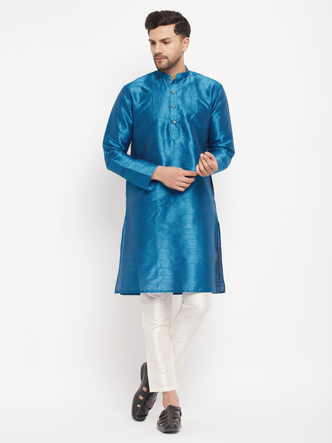 Turquoise Blue Cotton Silk Blend Kurta and Pant Style Pyjama Set.