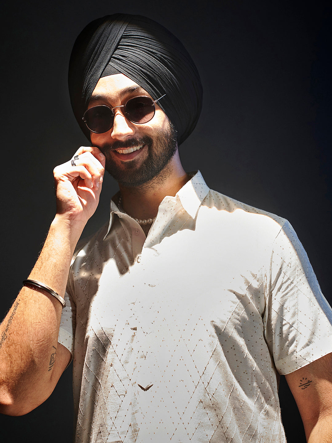 This ethnic combo set features a short-sleeved kurta crafted from high-quality viscose with a subtle sheen and allover sequined work, giving it a refined yet modern appeal. Paired with a solid draped lungi designed with pleats for a relaxed and traditional vibe, the outfit is completed with a matching pleated safa (turban) that adds height and sophistication. Together, the set creates a cohesive and regal festive look.
