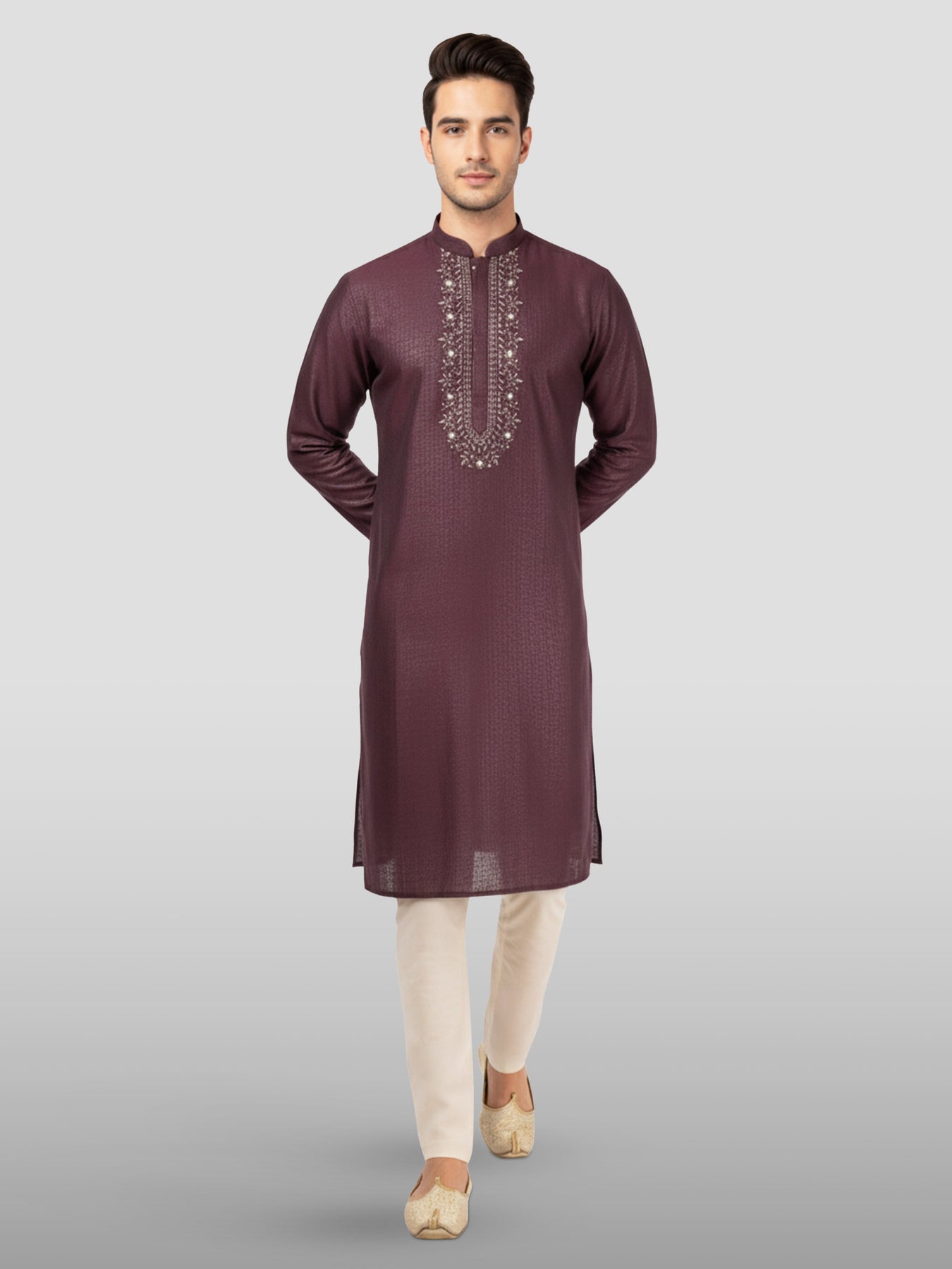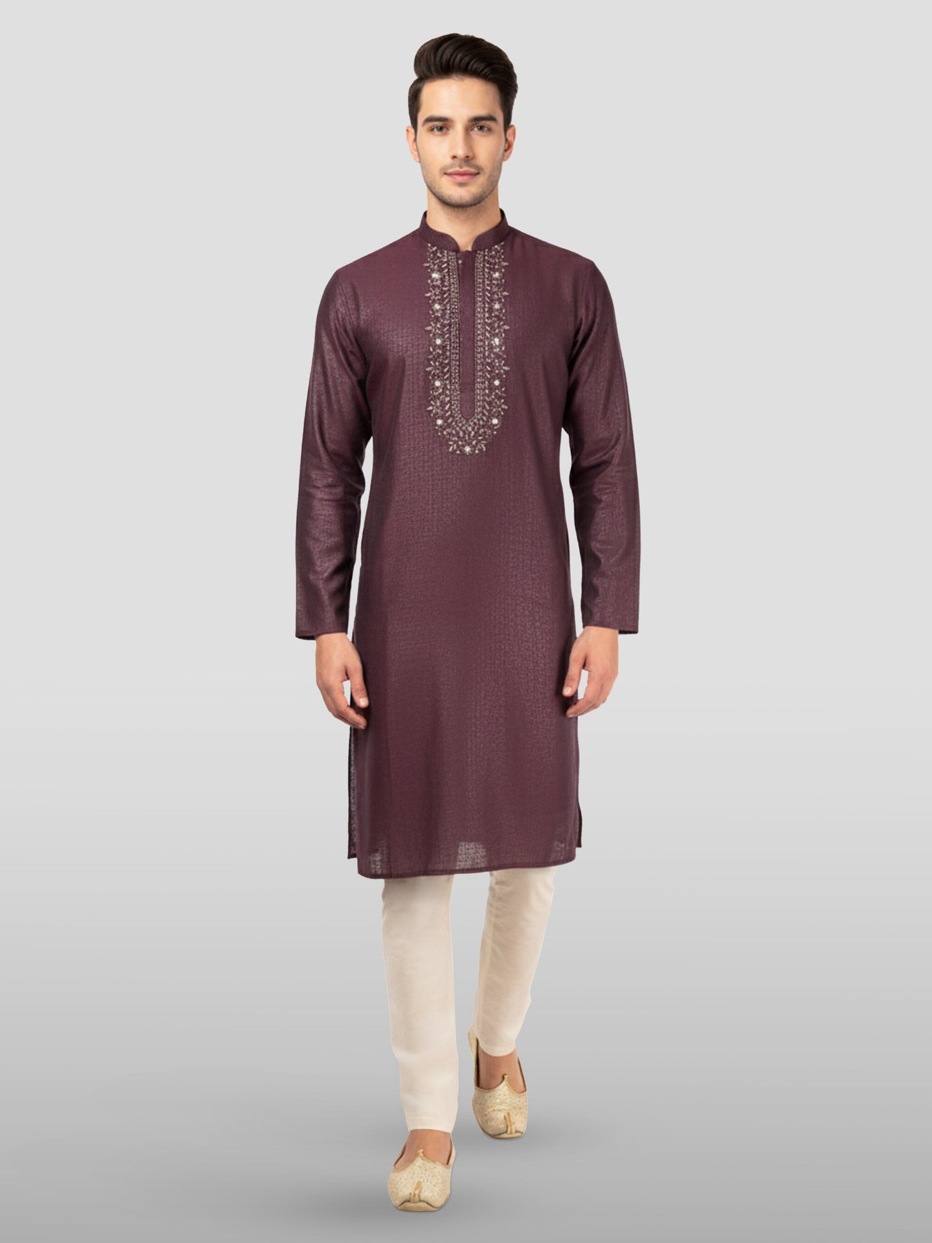 Add elegance to your ethnic wardrobe with Sarvati wine embroidered kurta set. Features beautiful beads and mirror work with traditional floral motifs on premium silk blend, paired with comfortable cream cotton lycra pyjama.