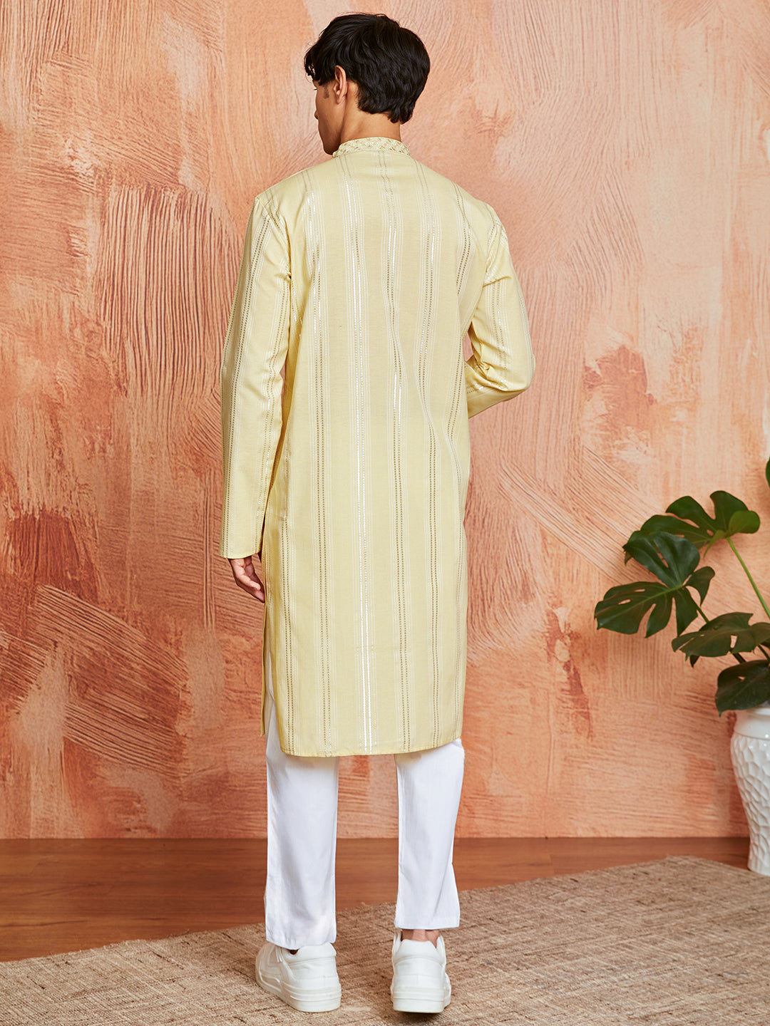 Make a refined style statement with this jacquard silk blend kurta and pant set, crafted for festive and celebratory occasions. The kurta features a woven jacquard design with vertical shimmer accents, coupled with a delicately embroidered collar placket that adds sophistication and elegance. Paired with classic white pants, this ensemble strikes the perfect balance between tradition and modernity.