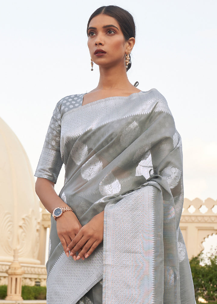 Zari Woven lead Grey Linen Silk Saree – Perfect for Summer