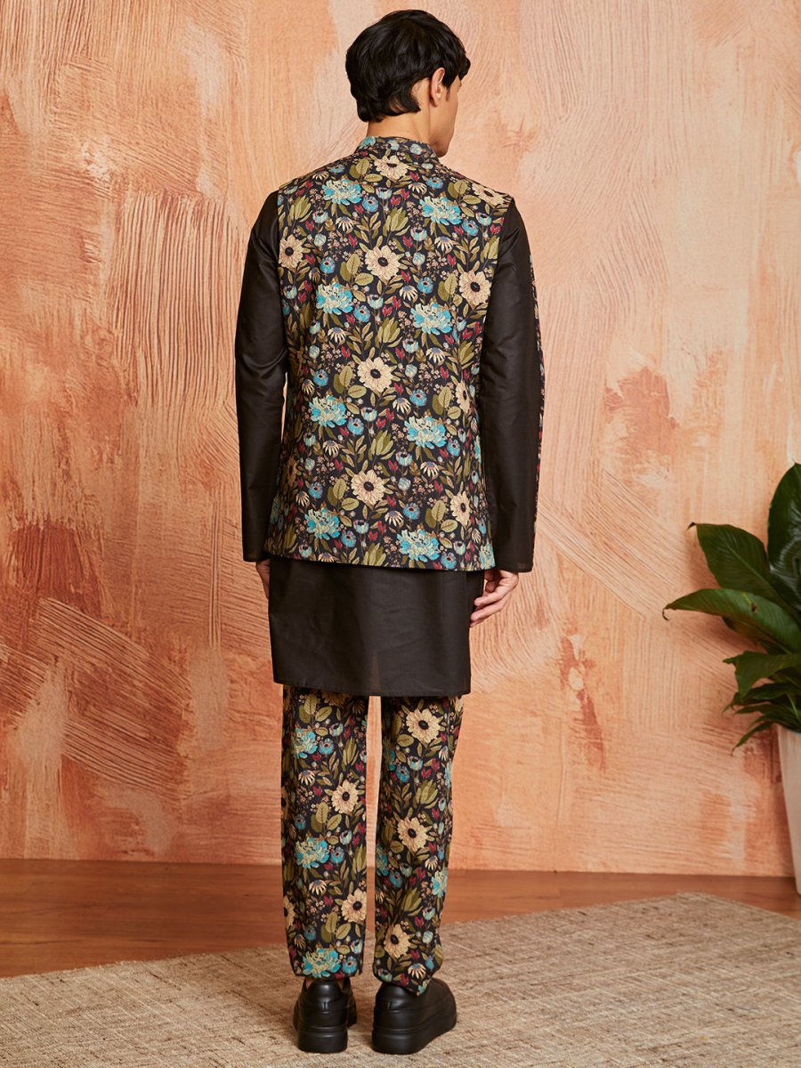 Elevate your ethnic wardrobe with this Men's Black Cotton Jacket Kurta and Pyjama Set. Featuring a rich floral-printed Nehru jacket over a solid kurta, this ensemble blends tradition with modern sophistication. The matching printed pyjama adds a unique touch, making it a standout outfit for weddings, festive occasions, and cultural gatherings. Made from breathable cotton, it offers all-day comfort and effortless style. Pair with ethnic footwear or sneakers for a trendy fusion look.