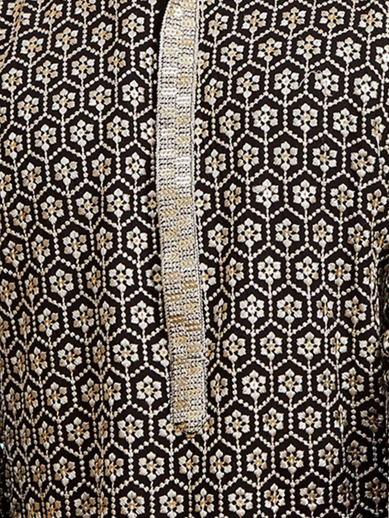 Add elegance to your ethnic wardrobe with Sarvati black sequin kurta set. Features beautiful sequin and thread embroidery with traditional motifs on premium rayon, paired with comfortable cream cotton lycra trousers.