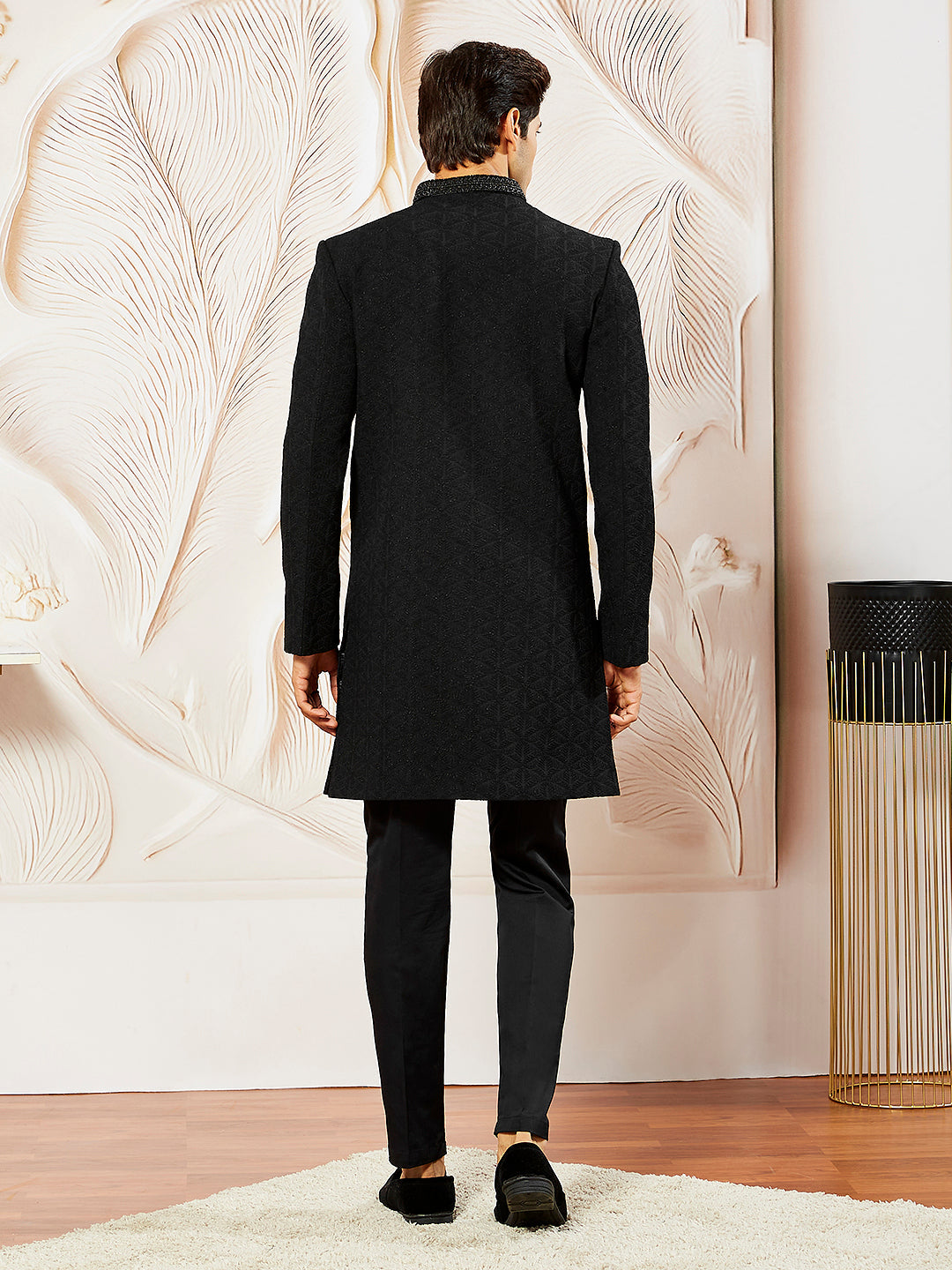 Silk Blend Emboss Fabric Above knee length Indo Western, has a mandarin collar, long sleeves.Comes with pant style pyjama,Wear it in parties,traditional functions and festive occasion.