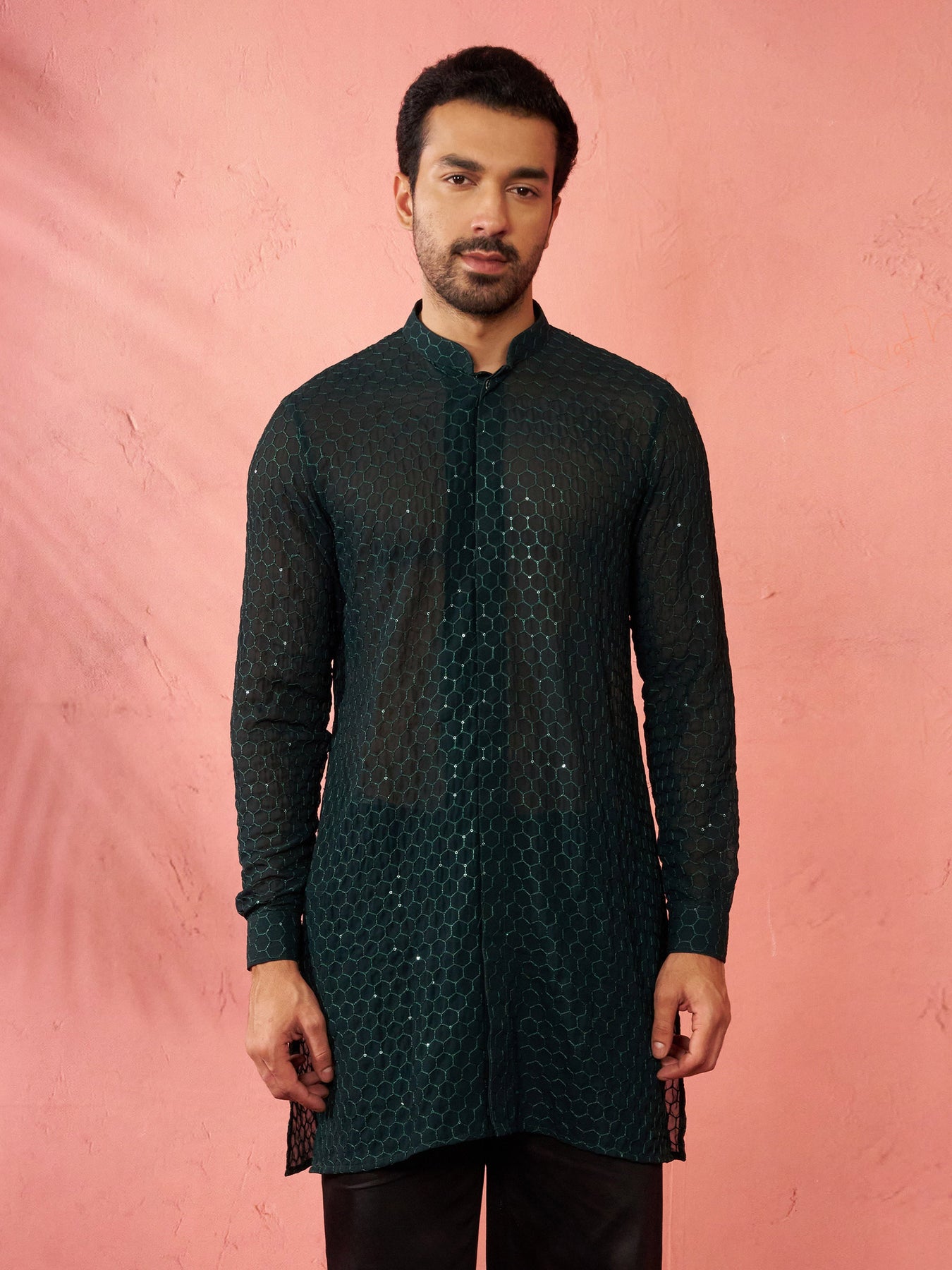Make a sophisticated impression with Sarvati bottle green georgette kurta featuring honey comb embroidery work with self-texture design. Concealed placket with mandarin collar, elegant cuffed sleeves, thigh length with side slits and practical inseam pockets. Perfect for Navratri, Diwali, weddings, parties, and festive celebrations across all regions.