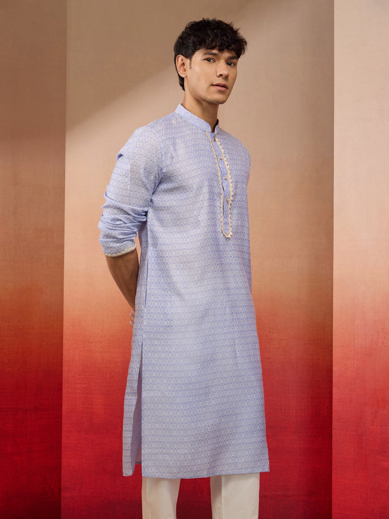 Experience elegance with Sarvati hawa colored silk blend jacquard kurta featuring sophisticated floral pattern and mandarin collar with button closure. Enhanced with lace detailing around placket, knee-length with side slits and practical inseam pockets. Perfect for weddings, Navratri, Durga Puja, Diwali, and refined festive celebrations.