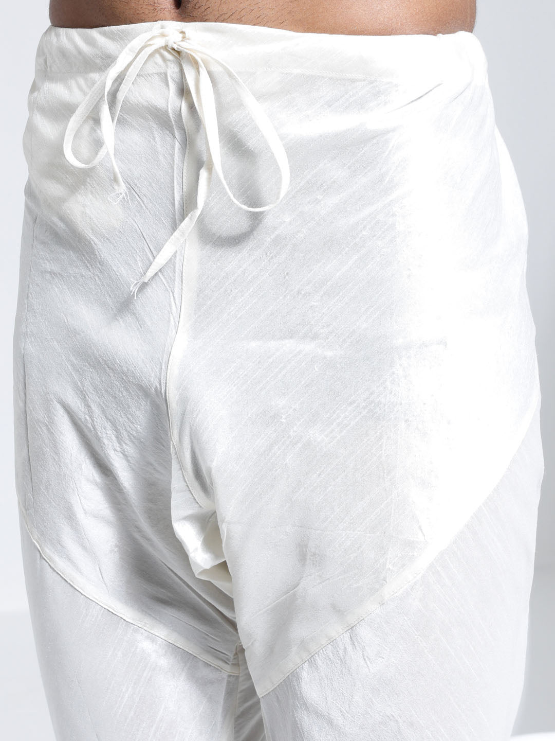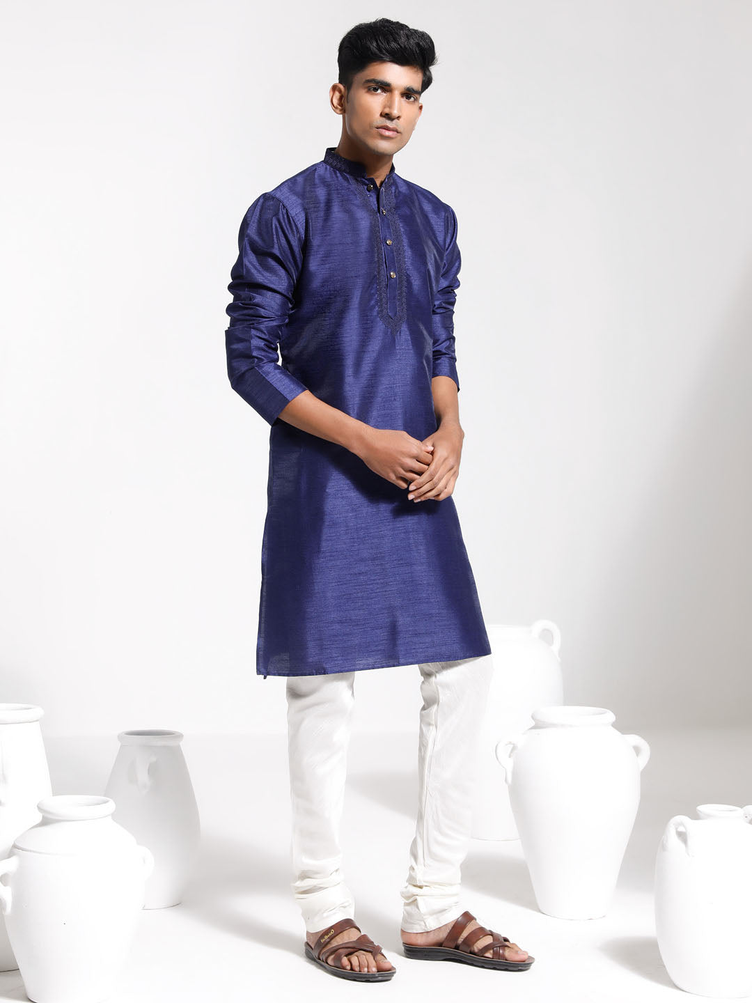 Sarvati Men's Navy Blue And Cream Dupion Silk Kurta Pyjama Set