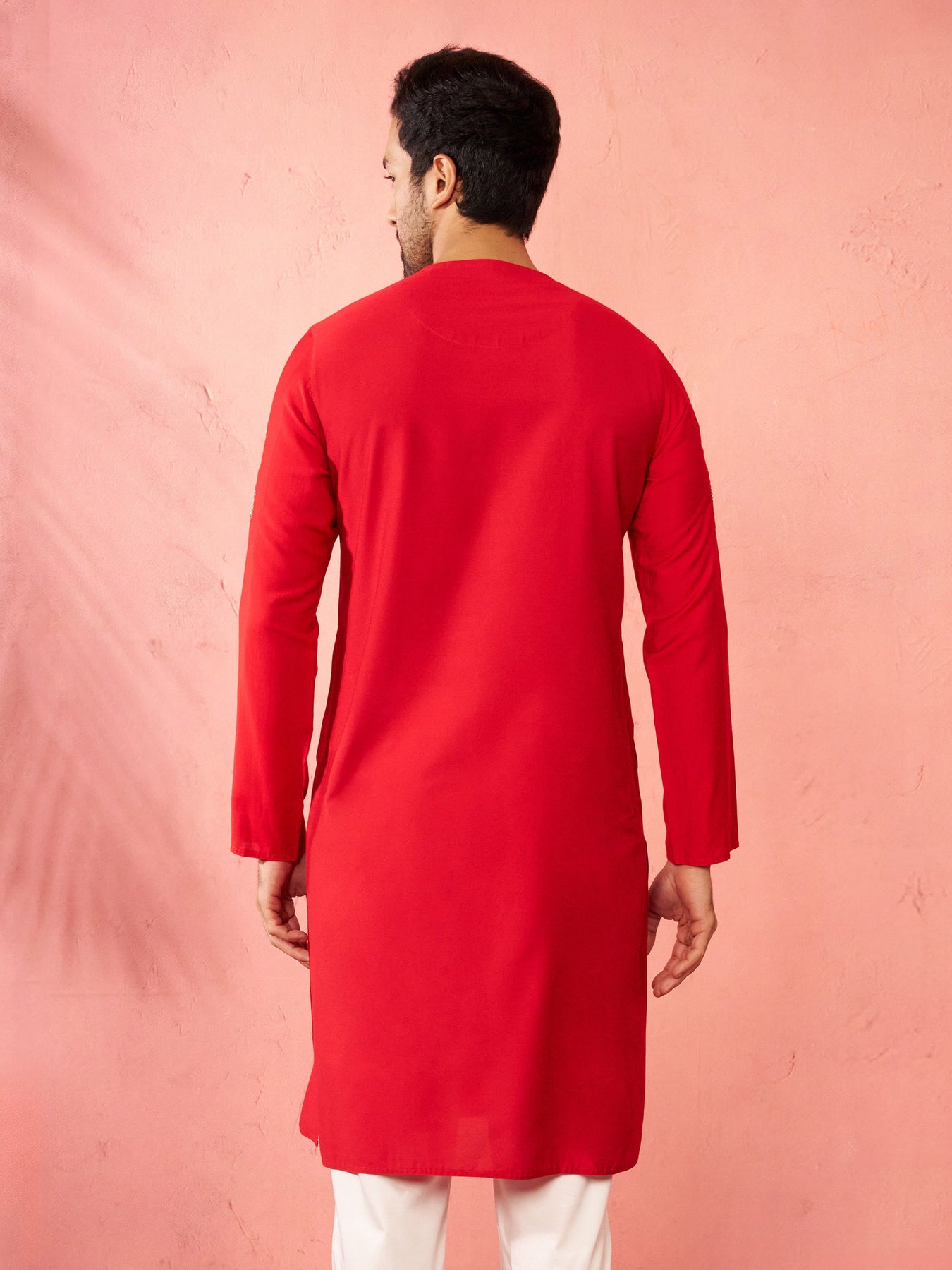 Make a striking impression with Sarvati red viscose kurta featuring intricate Zardozi embroidery. This beautiful kurta showcases ethnic motifs on the sleeves with decorative lace placement on the front for added elegance. The round neck design with button closure and full sleeves provides classic comfort. Crafted from premium viscose fabric, this knee-length kurta includes side slits and inseam pockets for functionality. Perfect for Navratri, Durga Puja, festive occasions, and traditional celebrations. Available in sizes 36-42.