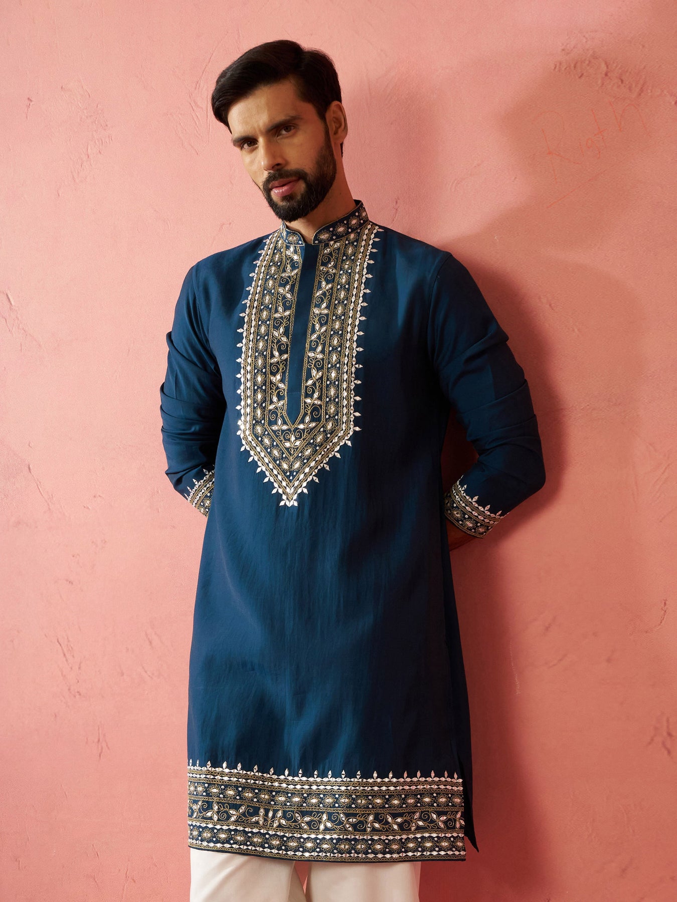 Elevate your festive wardrobe with Sarvati turquoise green modal chanderi kurta featuring authentic zari embroidery and mirror work. Traditional ethnic motifs on placket, collar, and sleeves with premium crepe lining.