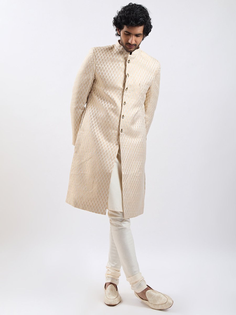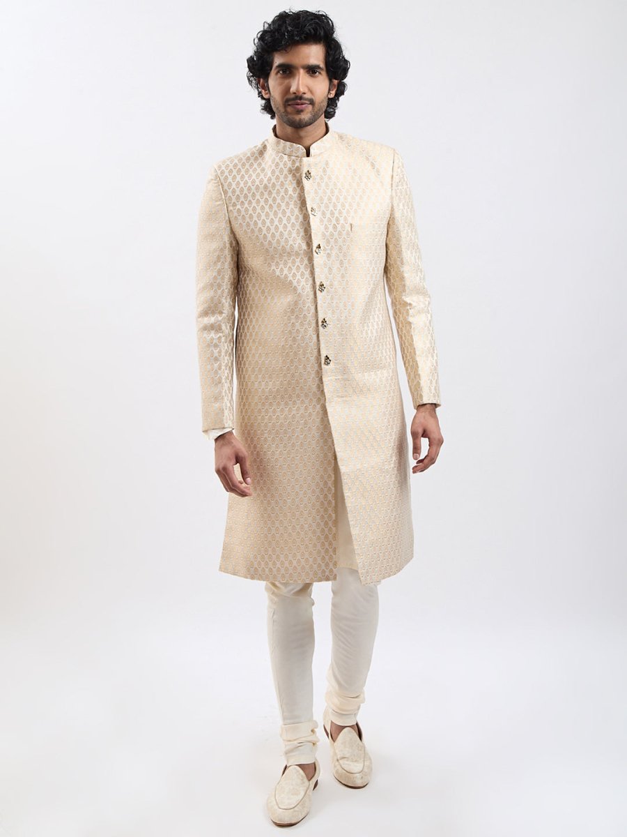 Step into refined elegance with this luxurious silk blend jacquard sherwani set. The sherwani features an intricate jacquard weave, exuding regal charm with its sophisticated patterns and subtle sheen. Designed with a classic mandarin collar and statement buttons, it adds a royal touch to your ethnic wardrobe. Paired seamlessly with a complementing kurta and fitted pants, this ensemble offers both comfort and grandeur. The soft, breathable fabric ensures a graceful drape, making it perfect for weddings, festive occasions, and celebrations. Complete the look with traditional footwear for a timeless and distinguished appearance.