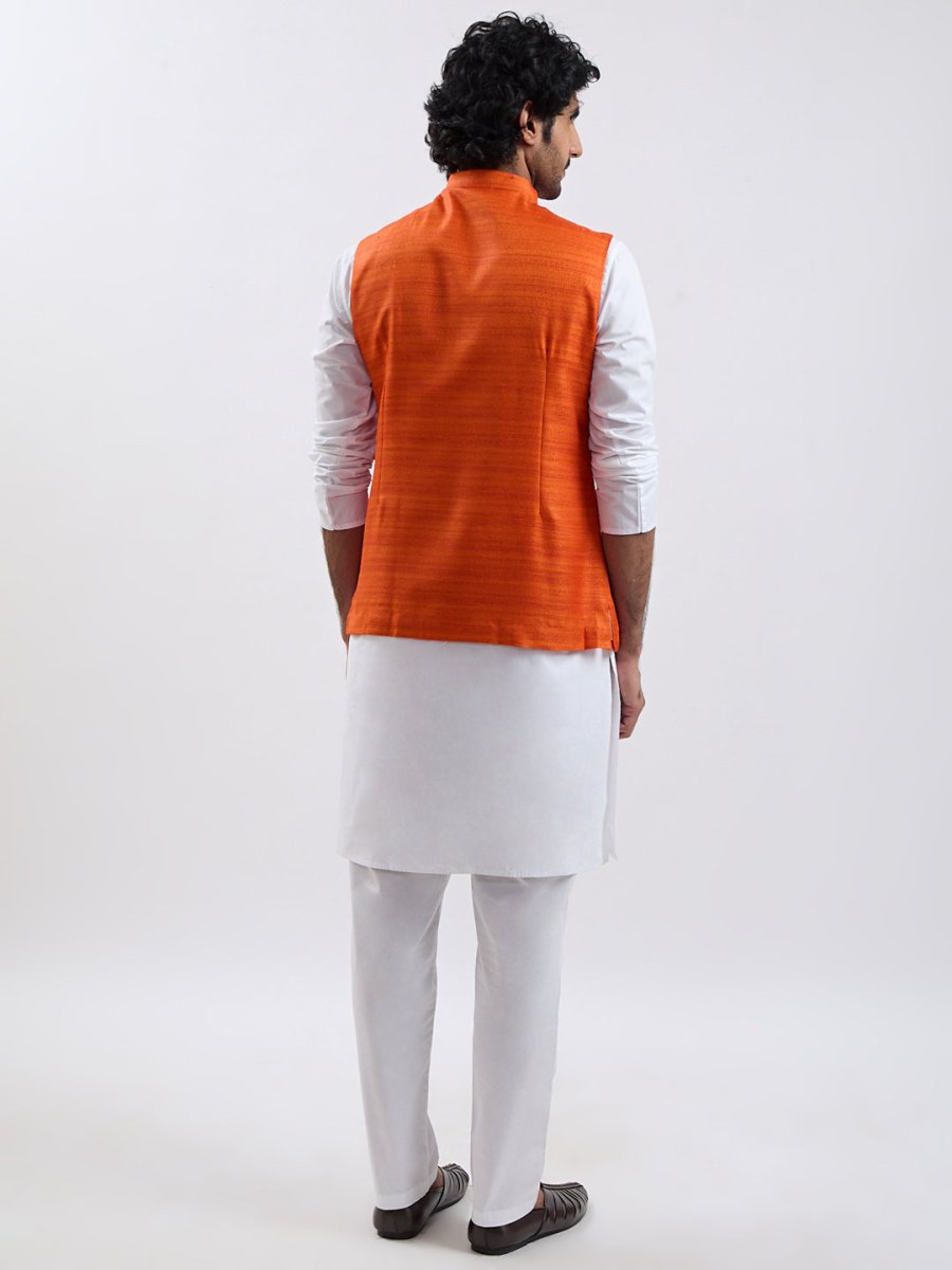 Two Tone Textured Matka Silk Nehru/Modi Jacket in Earthy Colors is Sleeveless, has a mandarin collar and classic wooden buttons. With white solid straight knee length kurta, has a mandarin collar, long sleeves, straight hem and side slits & White solid churidar, has drawstring closure.