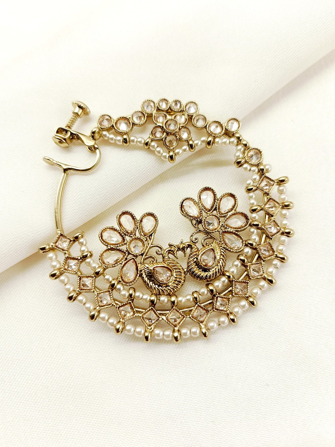 This Polki Nath Features Delicate Pearl Detailing And Is Crafted With Antique Gold Plated Brass Metal. It Does Not Require Piercing, Making It A Convenient Choice For Those Who Prefer A Unique And Stylish Accessory Without The Commitment. Add A Touch Of Elegance To Any Outfit With This Versatile Piece.