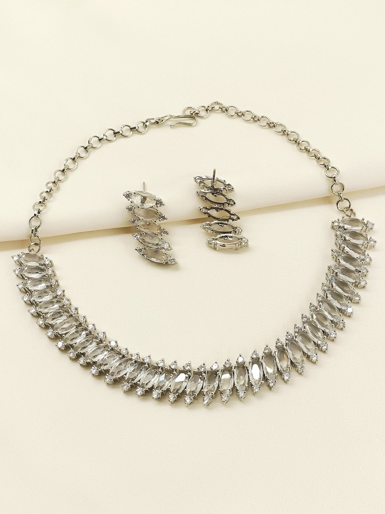 Beautiful And Stylish Design Of Complete American Diamond And Fancy Cut Shape Stone Neckline With Stunning Earrings - Silver Plated Brass Metal With AD And Stone