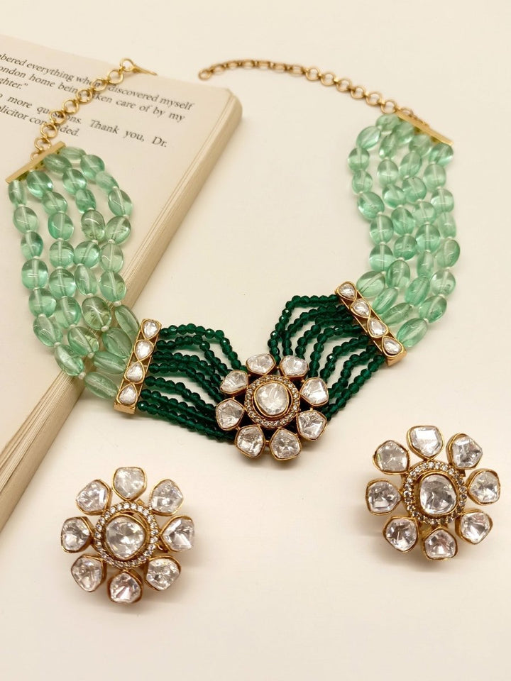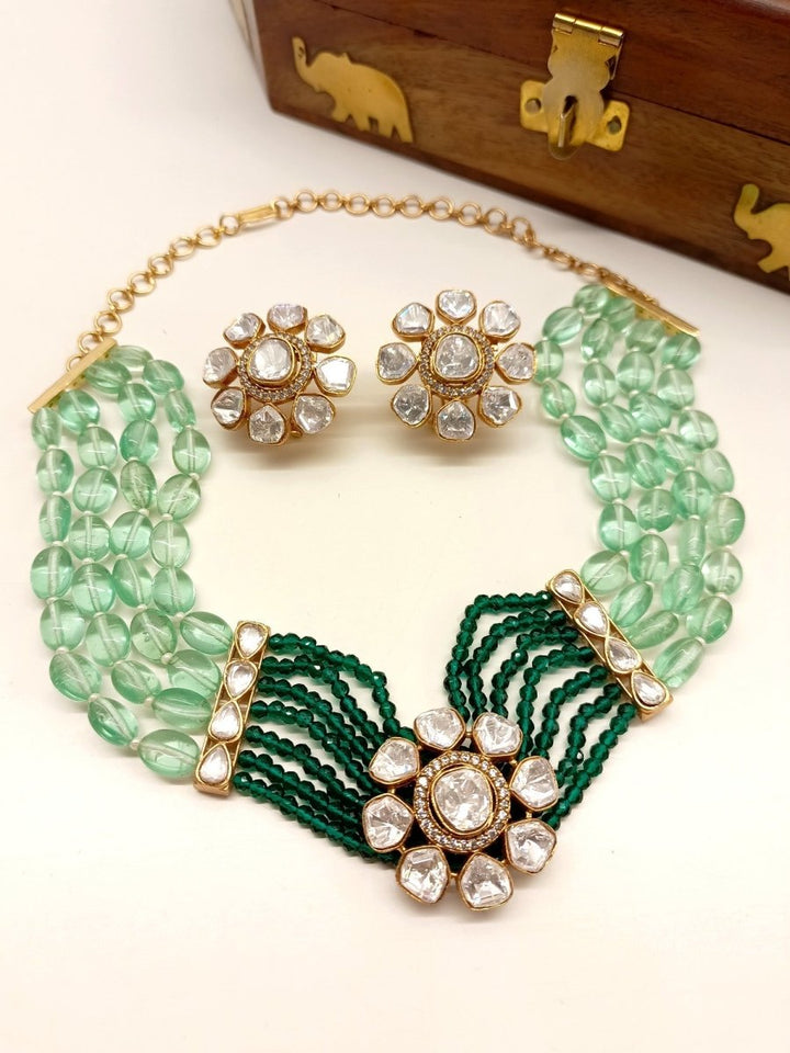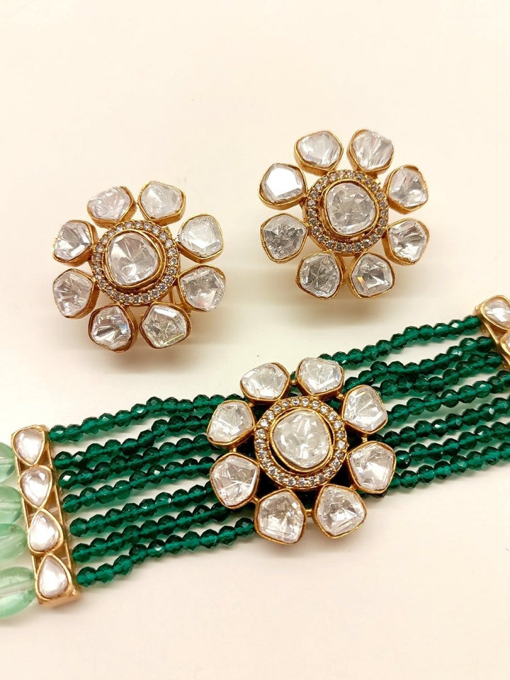 Introducing The Kundan Choker Set, Delicately Crafted For Beautiful And Timeless Style. This Elegant Set Is Composed Of Gold Plated Brass Metal Adorned With Intricate Kundan And Multiple Beads Chain, Plus A Stud On Clip On For An Added Touch Of Glamour.