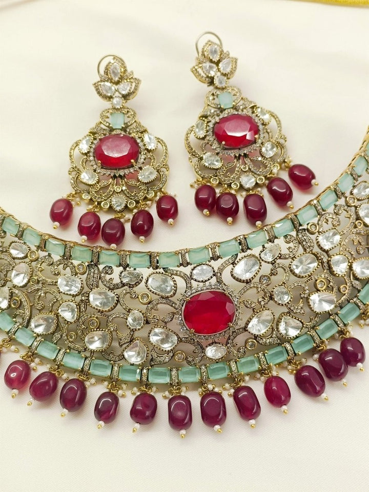 Add A Touch Of Vintage Elegance To Your Wardrobe With Our Mint Green Victorian Choker Set. This Traditional Choker Set Features An Antique Gold Plating And Delicate Beads Hanging From A Semi-precious Stone. Elevate Any Outfit With This Timeless Piece.