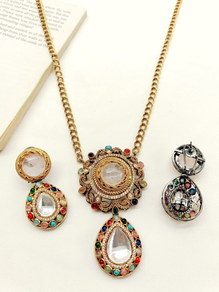 This Polki Pendant Set Is The Perfect Decoration For An Unforgettable Bridal Experience. Crafted From High Quality Antique Gold And Black Polish Brass Metal And Adorned With Beautiful Stones , This Traditional Kundan Set Will Shine And Sparkle For Years To Come.