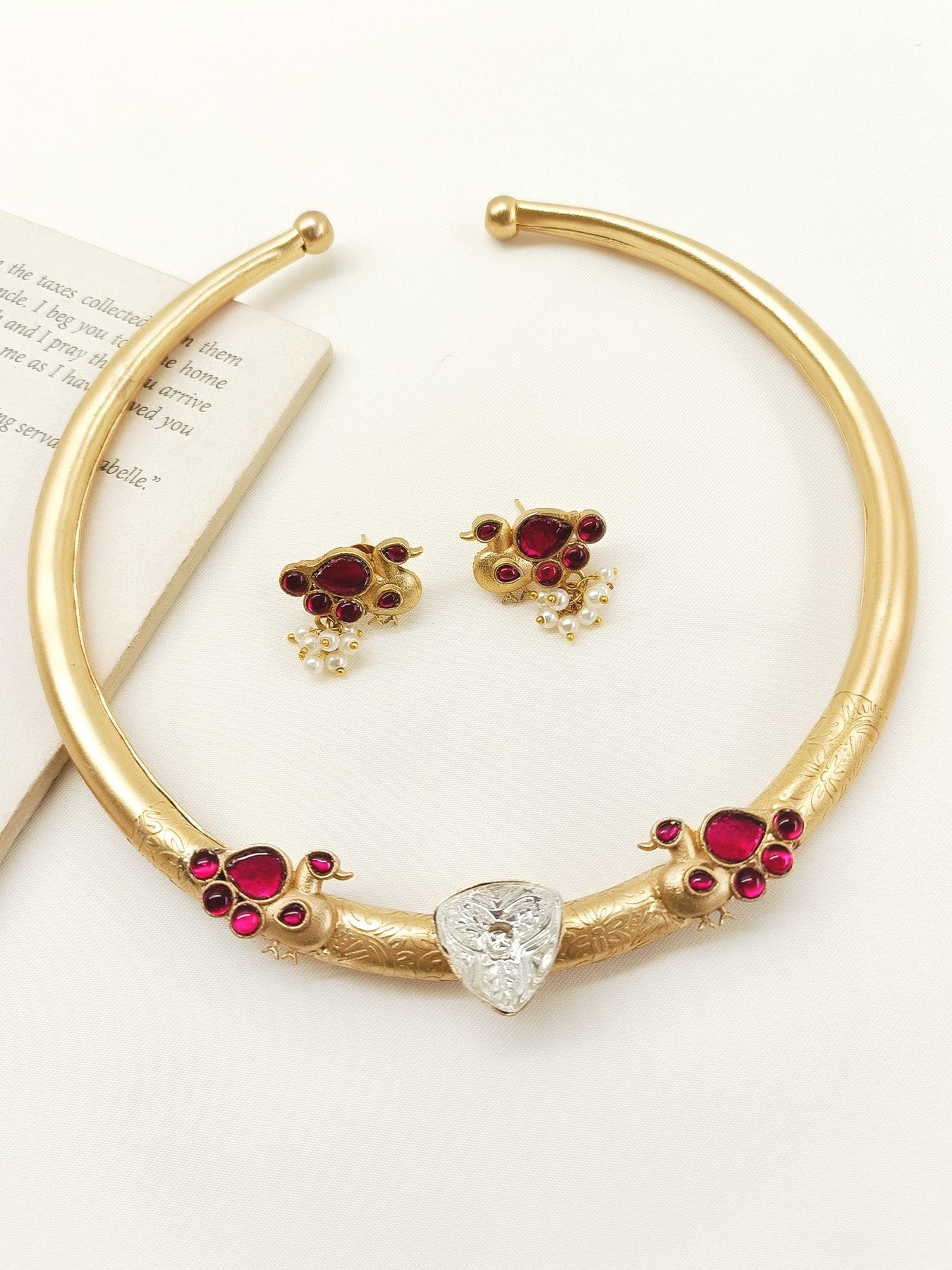 Elevate Your Ensemble With The Boutique Hasli Styled Choker Set, Expertly Crafted From Brass Metal With A Rich Gold Plating. This Statement Piece Features Carefully Selected Natural Stones That Enhance Its Traditional Allure While Ensuring Durability. Ideal For Adding A Distinguished, Cultural Touch To Both Formal And Festive Attire, This Choker Set Combines Timeless Craftsmanship With Sophisticated Design.