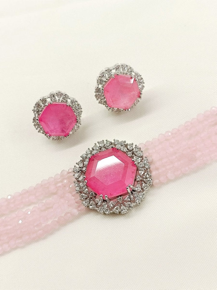 This Traditional American Diamond Choker Set Boasts A Silver Plating And Features Semi-precious Hydro Baby Pink Beads. The Centerpiece Pendant Is Adorned With A Doublet Stone, Adding An Elegant Touch To This Charming Piece. Enhance Your Outfit And Make A Statement With This Exquisite Choker Set.