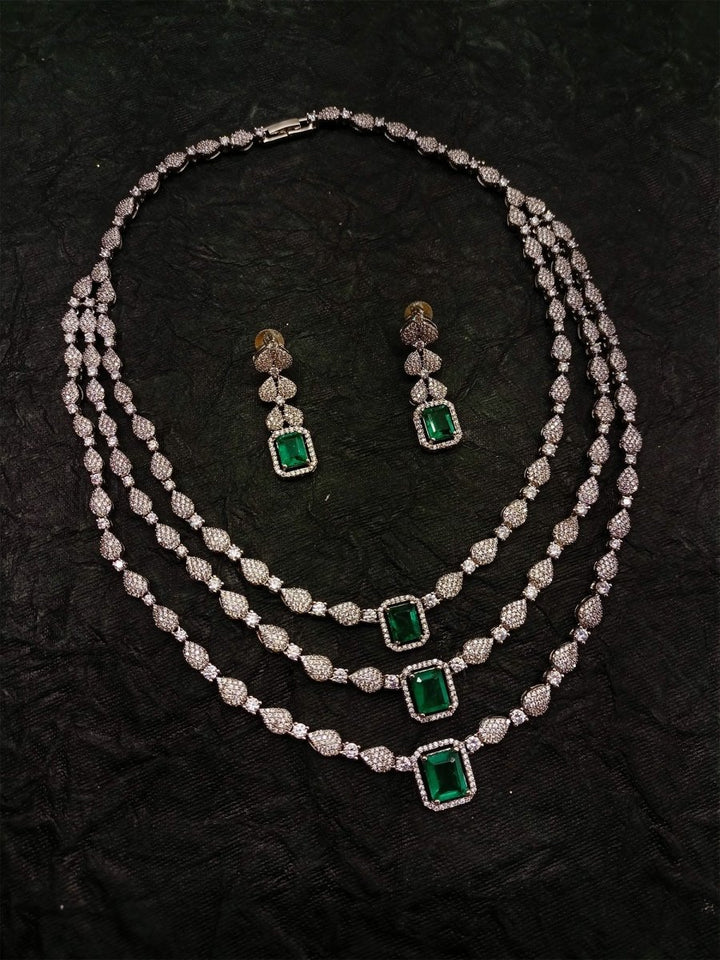 Silver Plated American Diamond Necklace Set With Semi Precious Emerald Stone Based On Brass Metal Paired With Small Earrings.