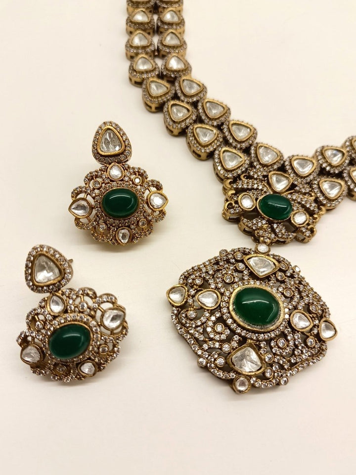 This exquisite necklace set boasts an emerald stone and luxurious kundan set on an antique gold plated victorian design. Its high-quality craftsmanship and finish make it a stunning piece of jewelry sure to add elegance to any look.