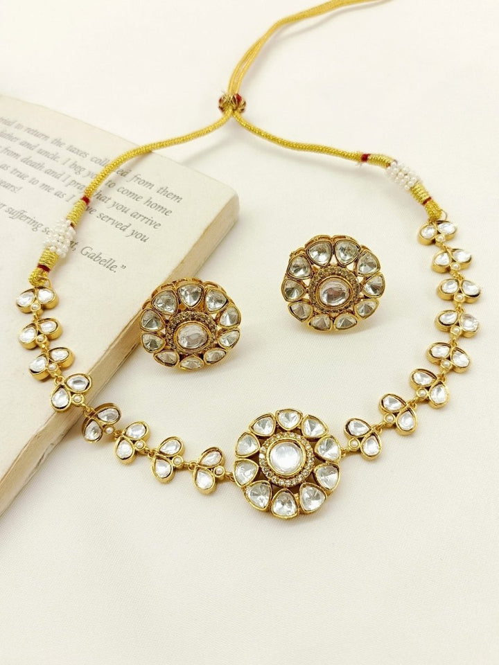 This White Kundan Choker Set Is The Perfect Blend Of Elegance And Modernity. Crafted With Gold Plated Brass Metal, It Features A Beautiful American Diamond Setting And A Green Stone At Its Center. Enhance Your Look With This Stunning And Unique Choker Set.