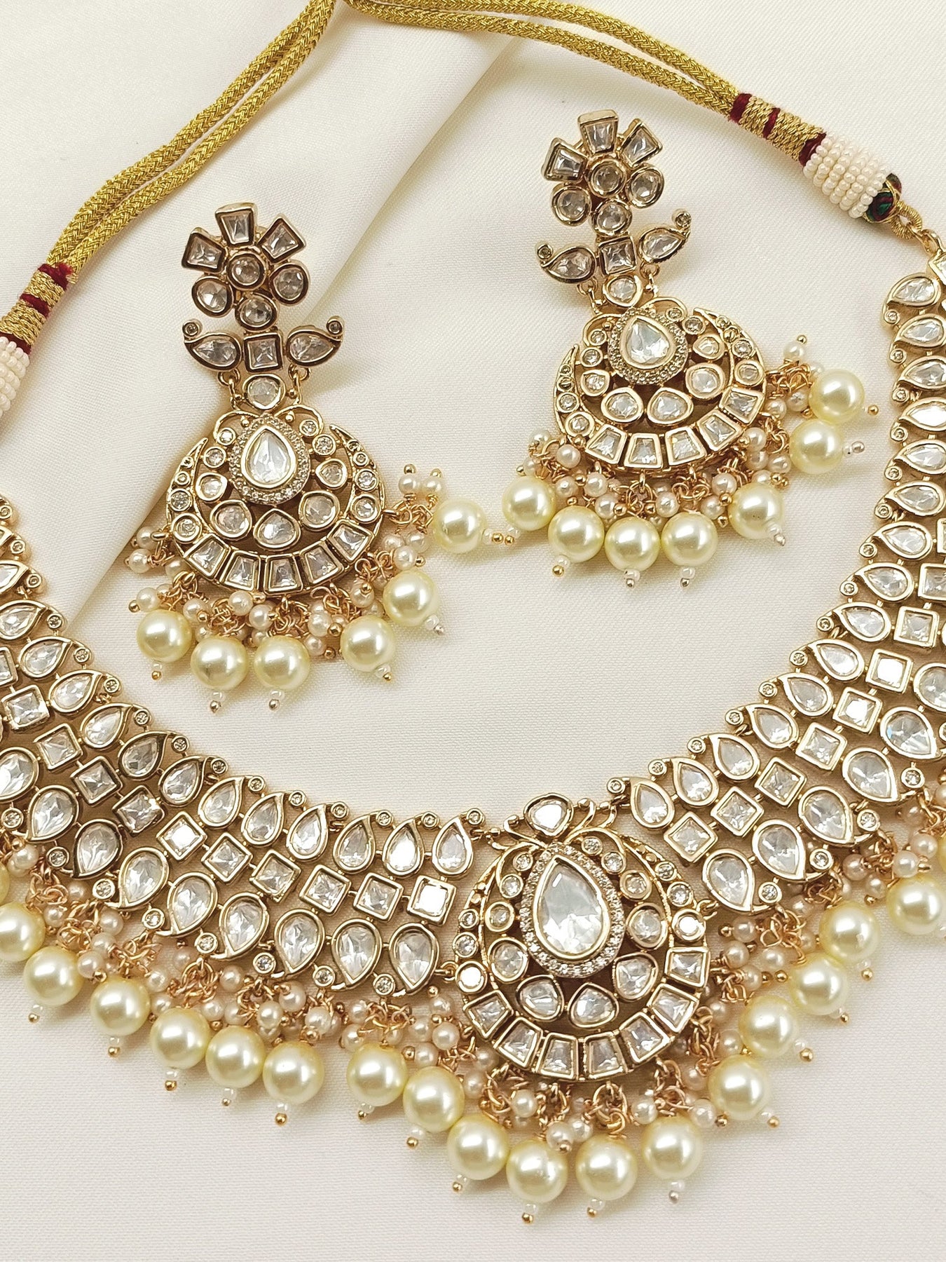 This White Kundan Necklace Set Is Perfect For Traditional Occasions. It Features A Gold Plated Brass Metal With Intricate Kundan Setting And A Pearl Hanging. It Comes With Matching Earrings And Is Finished With An American Diamond Setting. Perfect For Any Special Occasion!