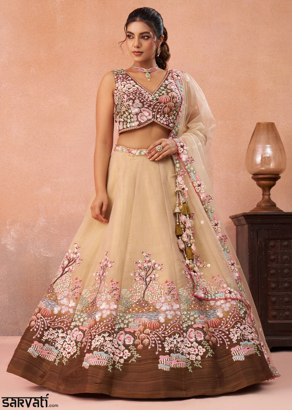 Brown & White Tissue Lehenga Choli with Beads & Sequins work