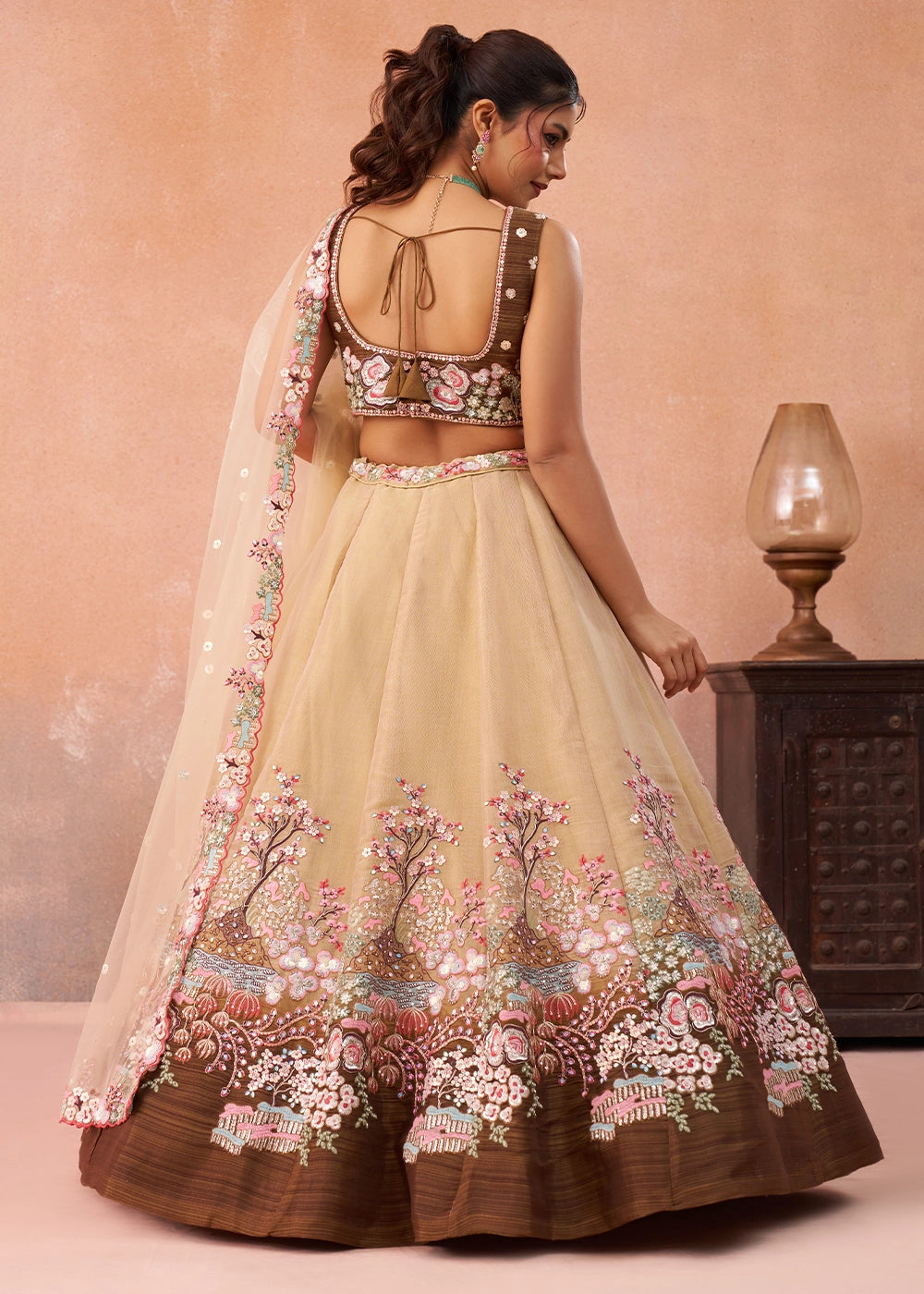 Shades Of Brown Net Lehenga Choli with Floral & Sequin Embroidery