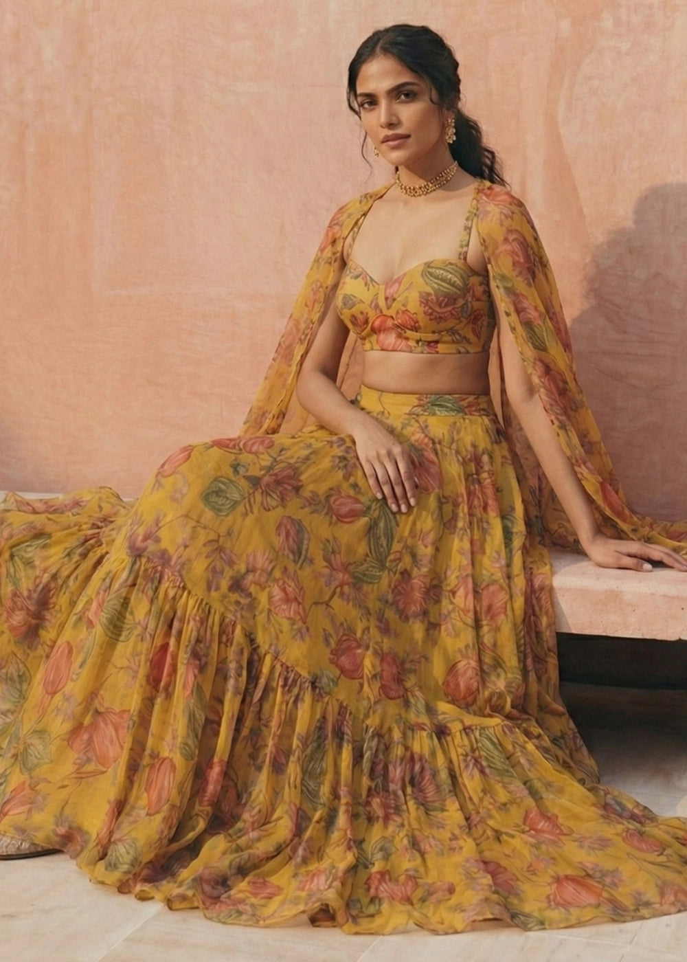 Amber Yellow Ready to Wear Floral Printed Lehenga Choli