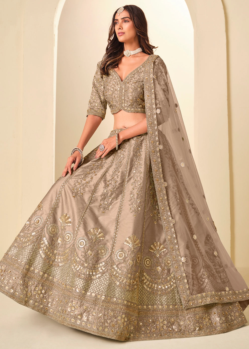 Latte Brown Wedding Wear Silk Lehenga Choli with Embellished Detailing