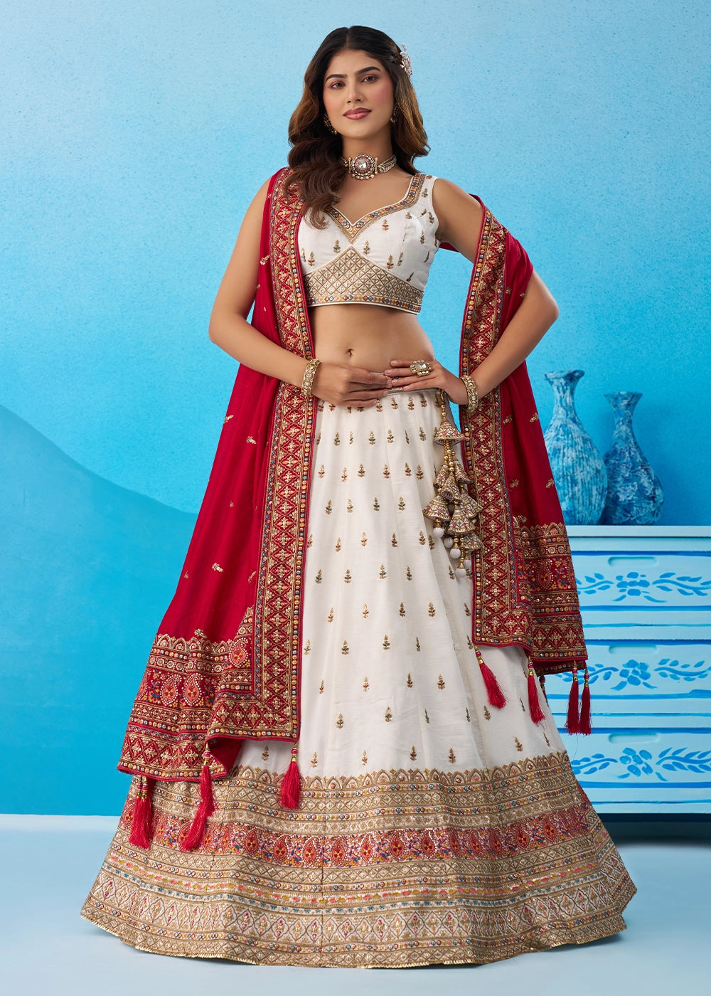 Pearl White Chinon Silk Lehenga Choli with Intricate Zari & Sequin Work